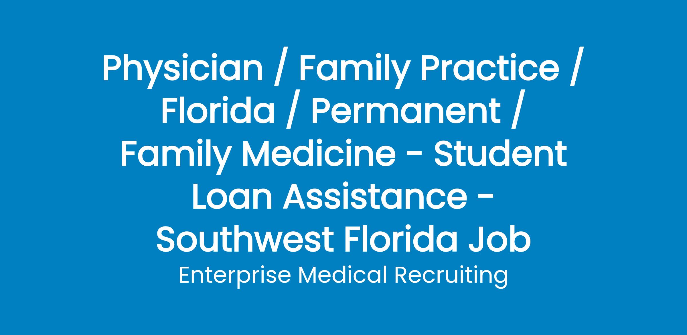 A Healthcare System in southwest Florida has an affiliated multi-specialty physician group that has an opening available for a Family Medicine physician.