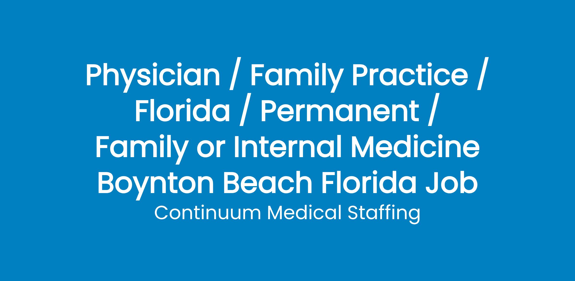 PRIMARY CARE (FM or IM) BOYNTON BEACH FLORIDA We are searching for a Family Medicine or Internal Medicine physician for a primary care practice. Located in Boynton Beach, FloridaImmediate NeedOutpatient Primary CareMonday Friday No weekends Very competitive compensation packageHealth InsuranceMalpractice InsuranceSpanish speaking a plus but not required.Contact
