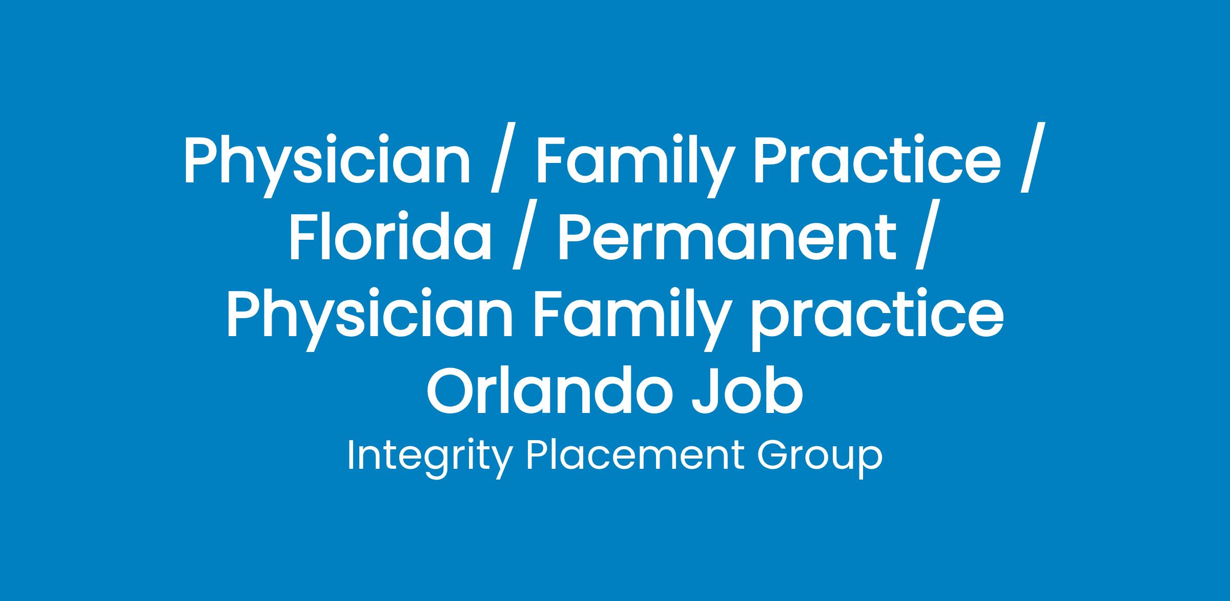 Family Practice PhysicianOur Client is a growing healthcare organization based in Orlando, FL that offers its employees full benefits, work/life balance.The Company: Our Client is a growing health care organization providing affordable quality primary and behavioral health care services to the residents of rapidly growing Orlando Florida area.The Position: Our Client is looking for a Bilingual Family Physician to join their growing team. Our Client is offering:Salary $170,000 - $200,000 based upon experience20 days PTO9 paid holidaysHealth-100% from day oneVision/DentalLTD & STDLife Insurance 1 X annual salaryCME $2500 and 4 days401k - 4% match after 1 yearStudent loan repayment NHIS $50,000 with a 2 year contractMalpractice covered per occurrenceResponsibilities:40-hour work weekFlexible schedulingFull support staff18 -22 patients per dayRequirements:Current Active Florida LicenseSpanish & English mandatoryClean recordPlease applyor send resume to