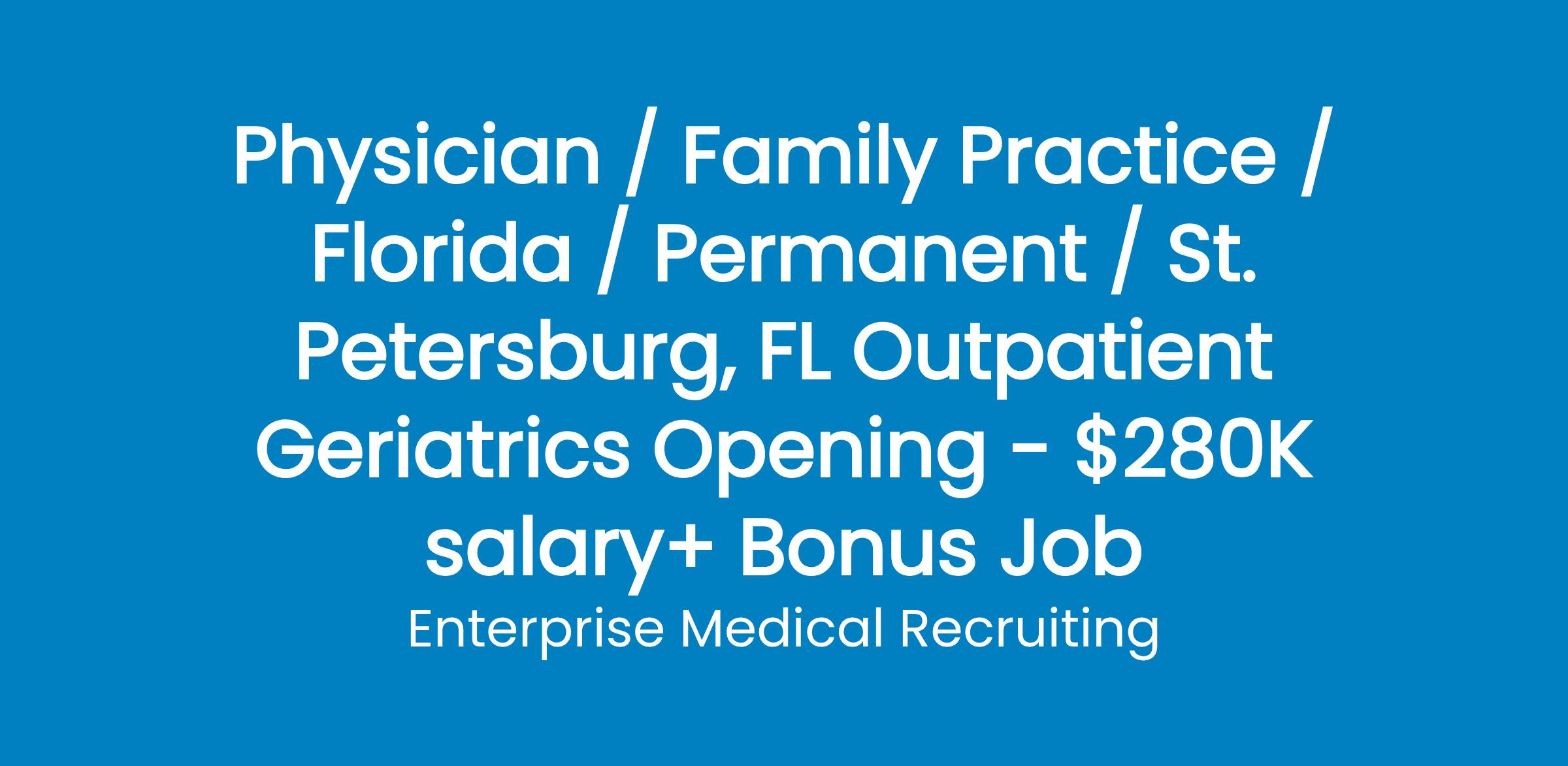 Family Medicine physicians, an opportunity has become available to join a group of 11 providers with 5 primary care physicians that serve the over-65 population in Southwest Florida.