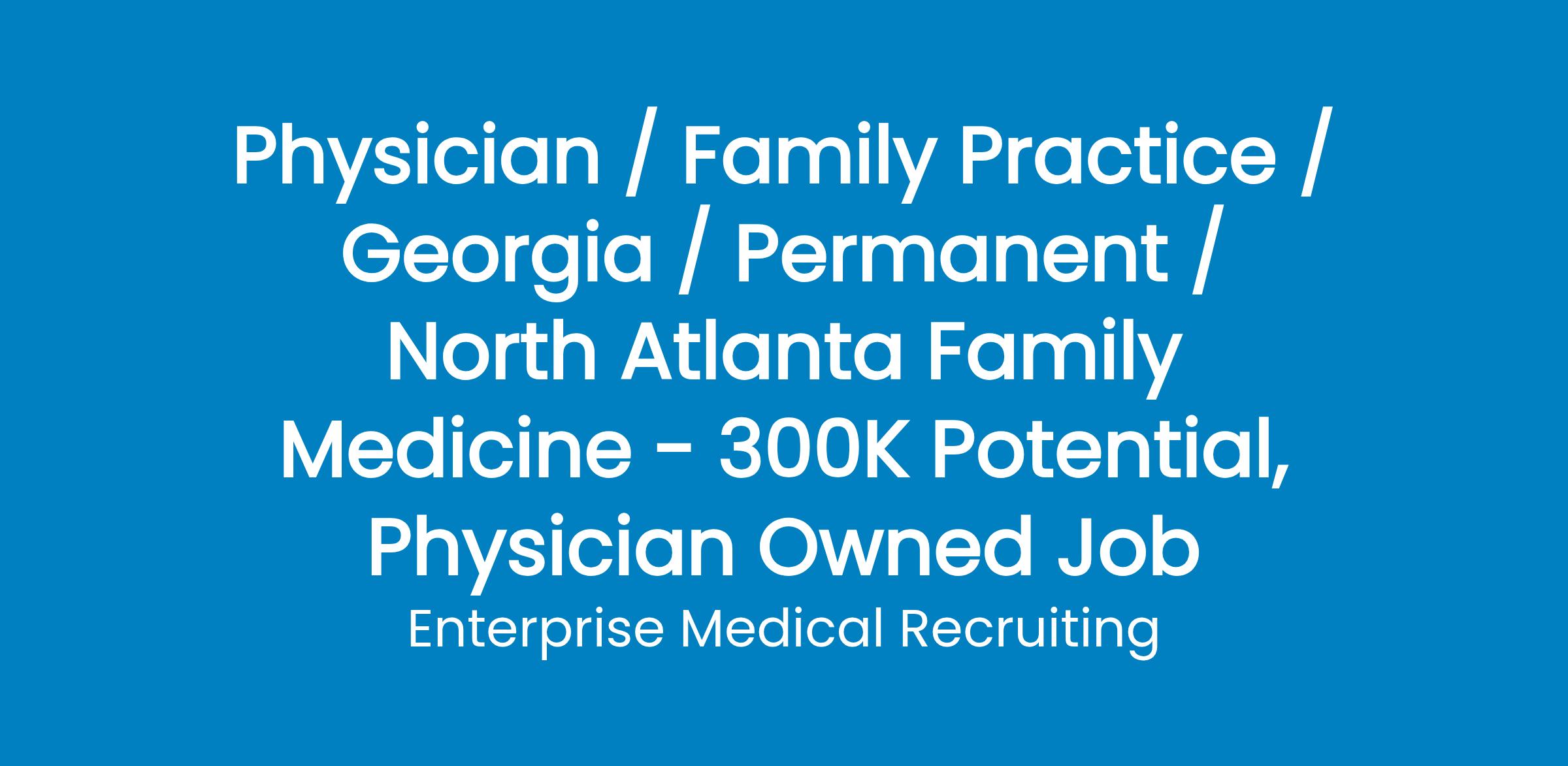 Enterprise Medical is representing a prominent physician owned and operated. group practice with five offices in the greater Atlanta area. The group has an opening for a family medicine physician in Gainesville, GA.