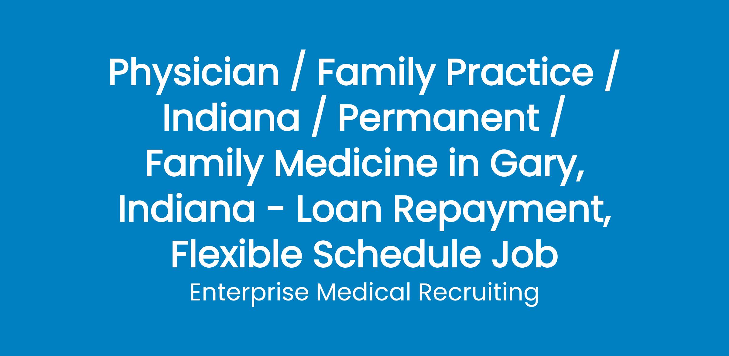 Enterprise Medical Recruiting is assisting a rapidly growing Federally Qualified Health Center (FQHC) in Northwest Indiana with the recruitment of family medicine physicians.We are seeking qualified, enthusiastic providers with a passion for the underserved patient population.