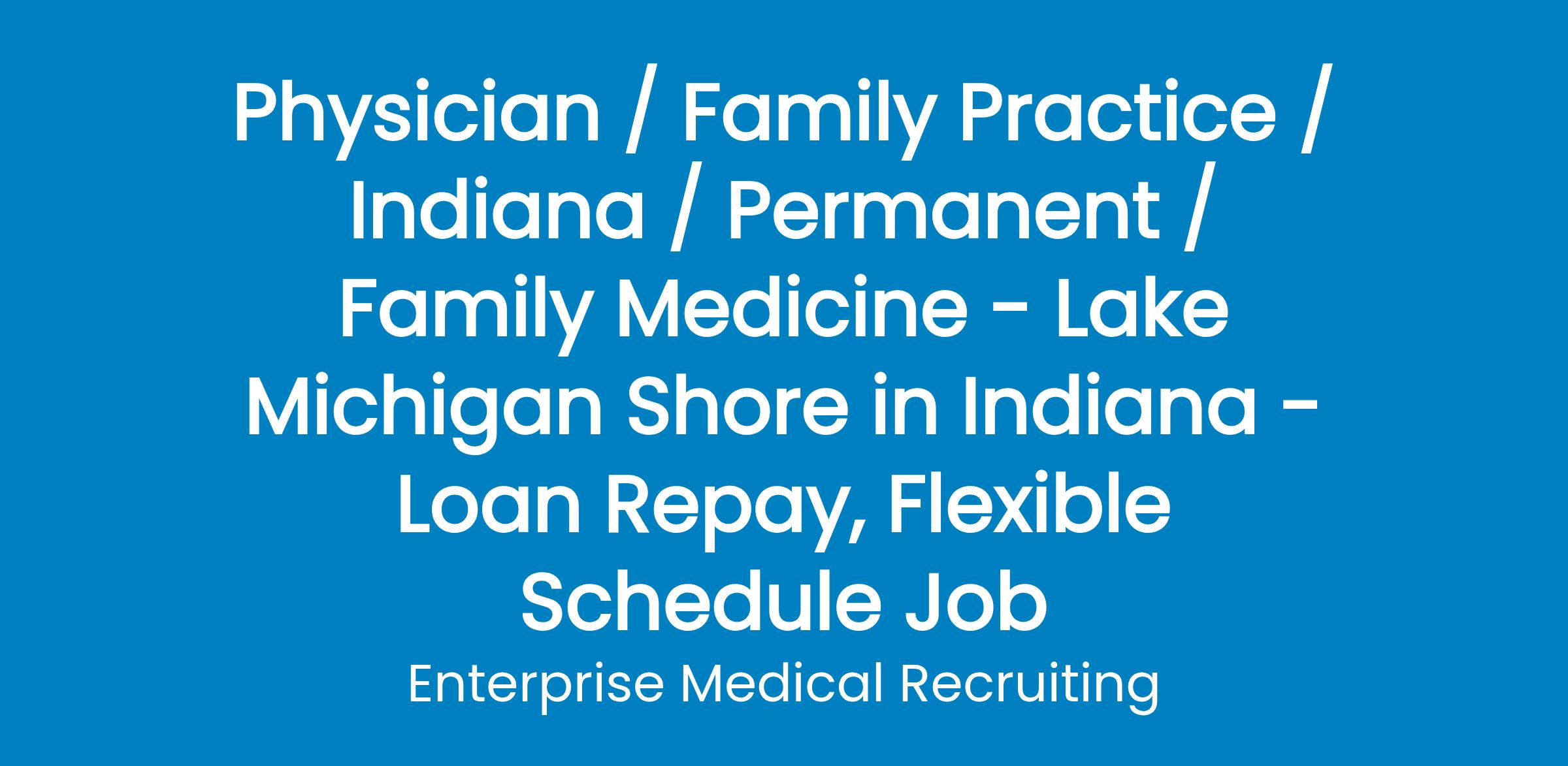 Enterprise Medical Recruiting is assisting a rapidly growing Federally Qualified Health Center (FQHC) in Northwest Indiana with the recruitment of family medicine physicians.We are seeking qualified, enthusiastic providers with a passion for the underserved patient population.