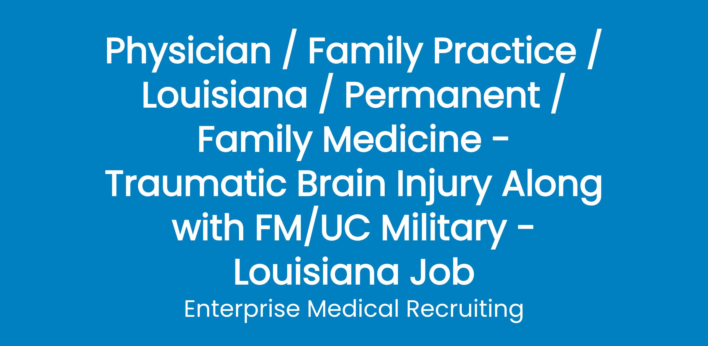 Enterprise Medical is assisting a group in southwest Louisiana for a Family Medicine physician. Work as part of a comprehensive healthcare team to evaluate and treat patients with Traumatic Brain Injury (TBI). The contract service provider must possess sound clinical reasoning and be able to synthesize complex evaluation and diagnosis data to develop individualized comprehensive plans of care.