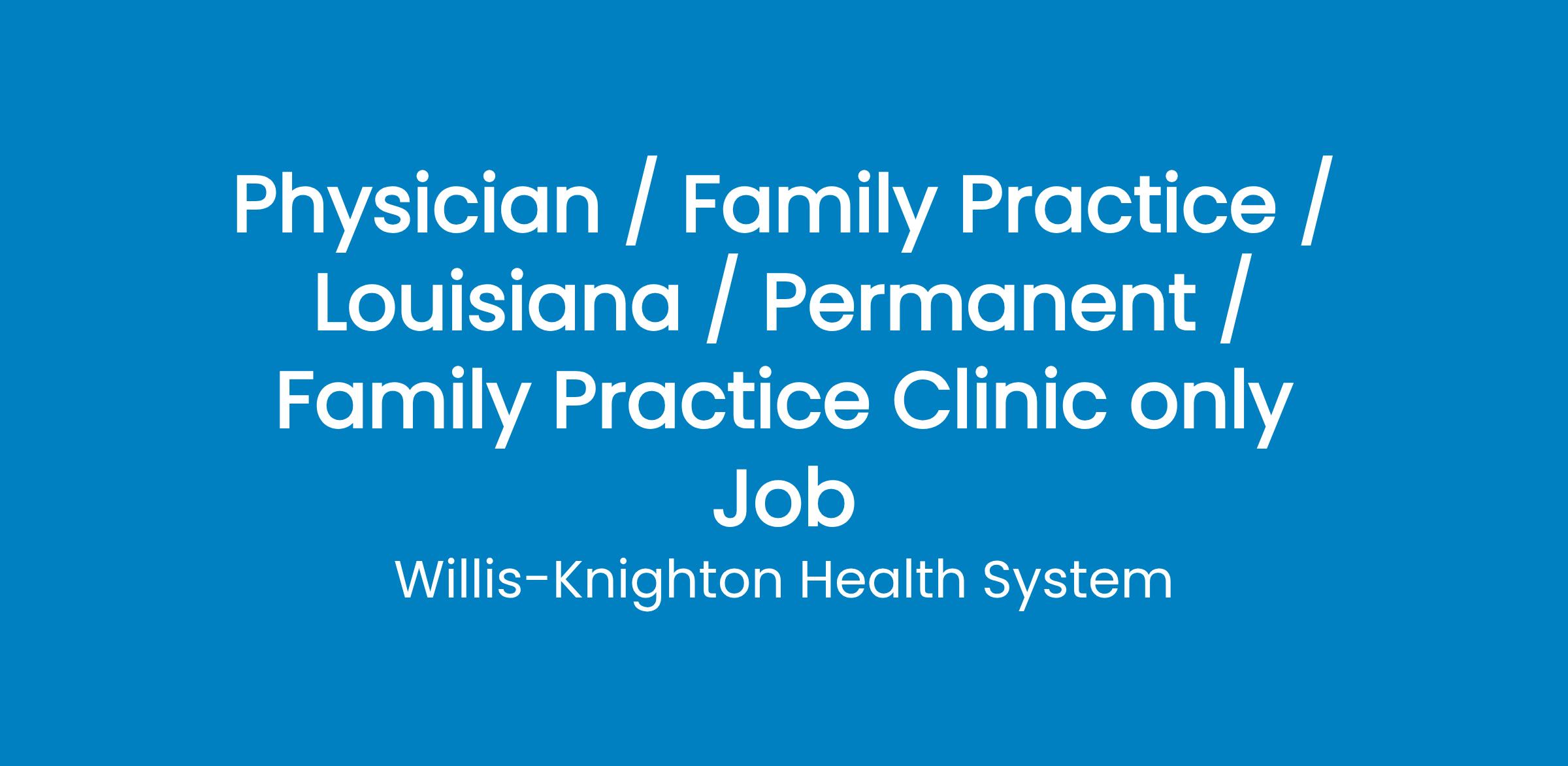 Family Practioner to join an established practice with one of the largest healthcare systems with over 450 providers in Northwest La. where you take care of the patients and we take care of the daily operations of your practice. Enjoy excellent Work-Life balance with family friendly office hours and light phone call. EMR and full support staff. Patient centered care. Highly competitive compensation package including base salary, production incentive, full range of benefits, including Defined Retirement, sign-on bonus, resident stipend and relocation allowance. Beautiful weather, affordable housing, excellent school system in a family friendly atmosphere.