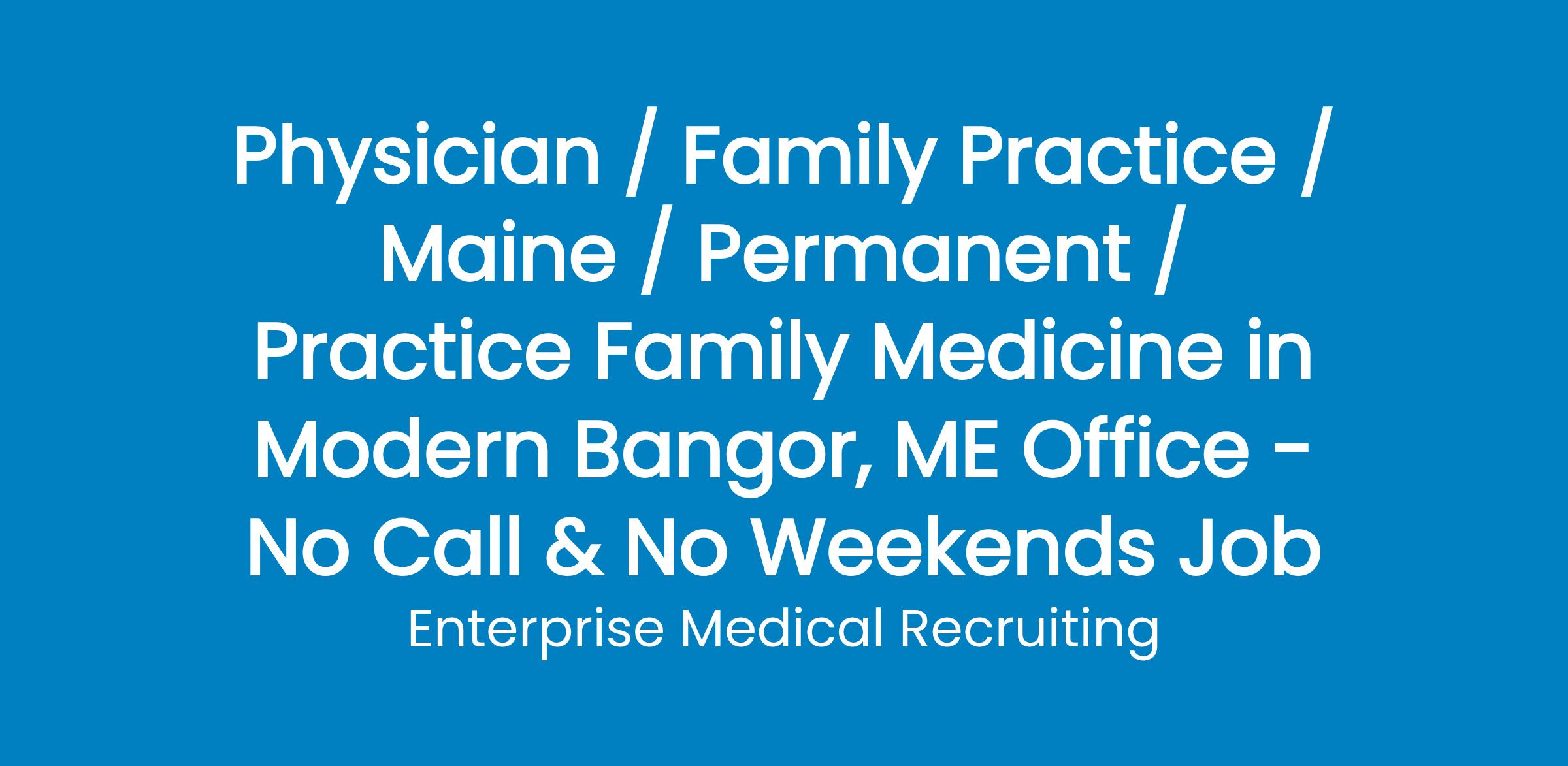 A beautiful primary care office in Bangor, Maine, has an opportunity for a Family Medicine physician. Join an organization that offers quality healthcare that improves how patients and providers experience healthcare. Deliver thoughtful solutions by combining modern clinics with modern technology to deliver high-quality, easily accessible, team-based care across in-person and virtual primary care settings. Located in Bangor, Maine's finest city!