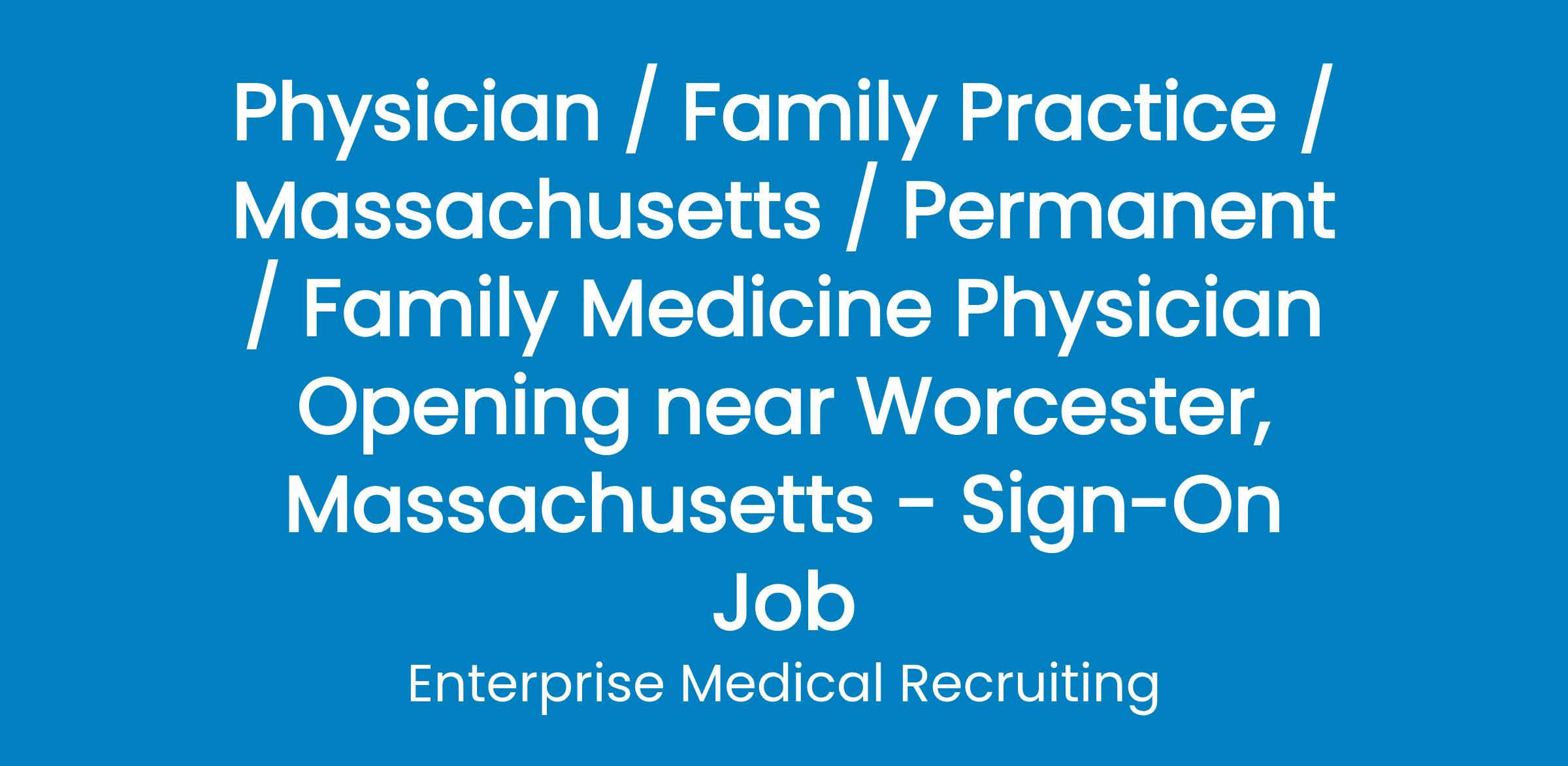 A private, not-for-profit medical group close to Worcester, Massachusetts has an opening for a Family Medicine Physician. This premier health system prides itself on providing e xceptional patient care, academic excellence, and leading-edge research.