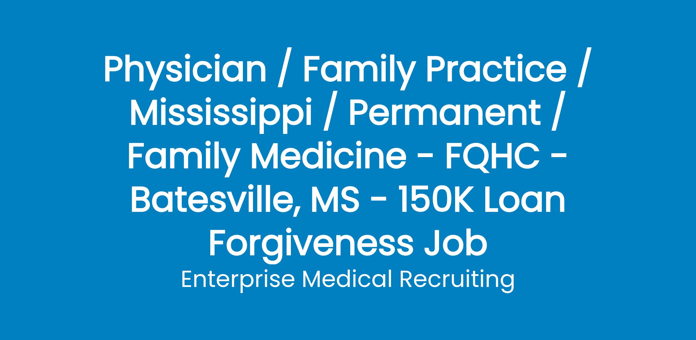 We are partnering with a Community Health Services Center that has been answering the call of Mississippi residents seeking comprehensive, affordable healthcare for over 40 years. Their approach includes services aimed at promoting healthier lifestyles, from primary and preventive medical care to dental services, family planning, pediatrics, public transportation, social services, nutritional education, and community outreach. Seeking highly compassionate Family Medicine physicians due to community growth and demand.