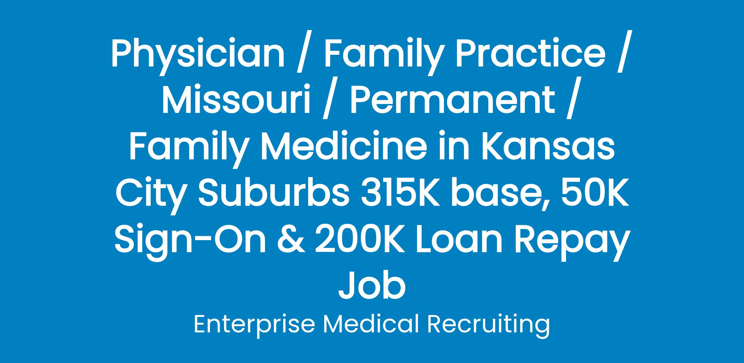 Affiliated with the Mayo Clinic, this financially sound outpatient practice north of Kansas City, Missouri, is searching for a Family Medicine physician due to community growth.