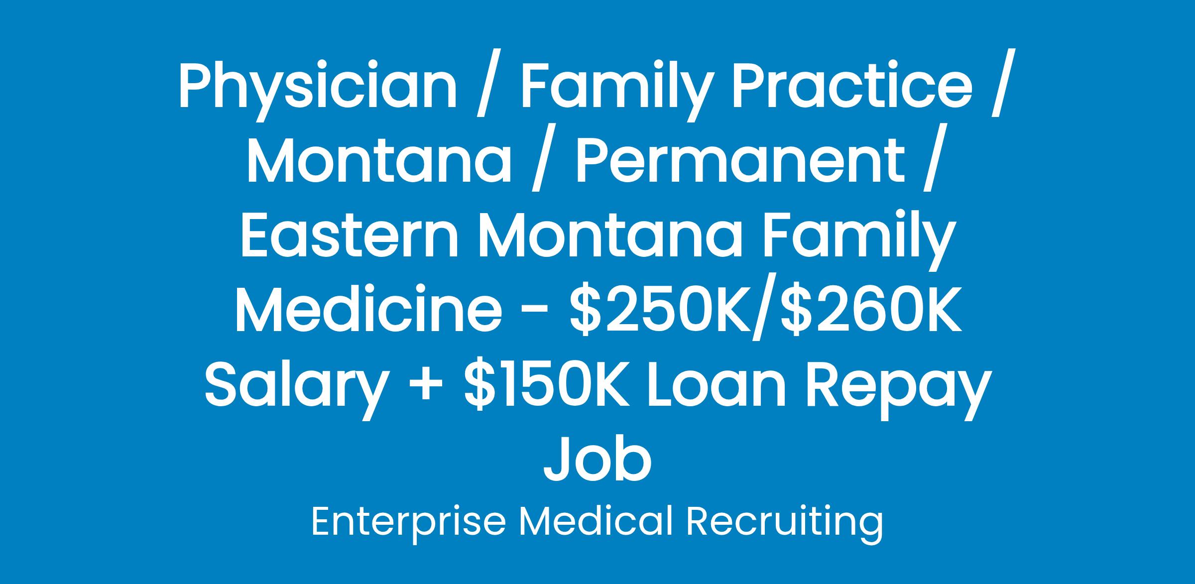 A hospital in Glendive, Montana, has an opening for a Family Medicine physician. The new candidate will join an Internist, Family Medicine, Med-Ped, and Pediatrician. This opportunity is due to community growth and demand.