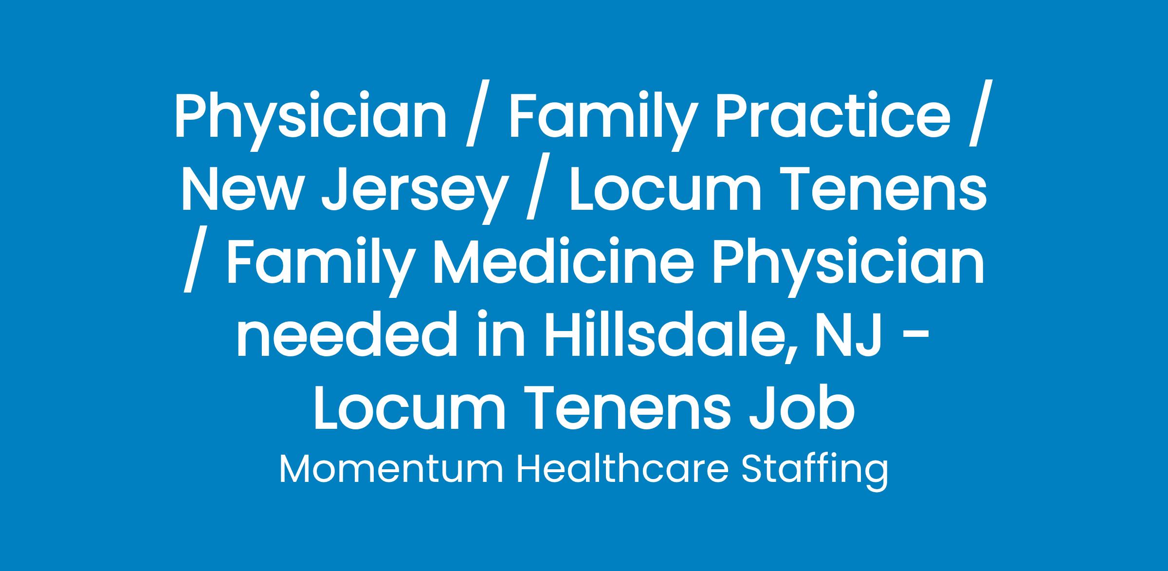 Momentum Healthcare Staffing is seeking a Family /Internal Medicine Physician in Hillsdale, NJ for a Locum Tenens opening. Please see the details below to apply!Requirements:Specialty: Family/Internal MedicineLicense: New JerseyEducation: MDAdditional details:Feb 12thHours 8-5APP or MDUrgent Care SettingEMR is DocutapIf interested, please respond with the following:1.Your CV2. Availability for a phone interview with Momentum to discuss salary, availability and next steps!Lisa TanPhysician Recruiter(407) or email me today!
