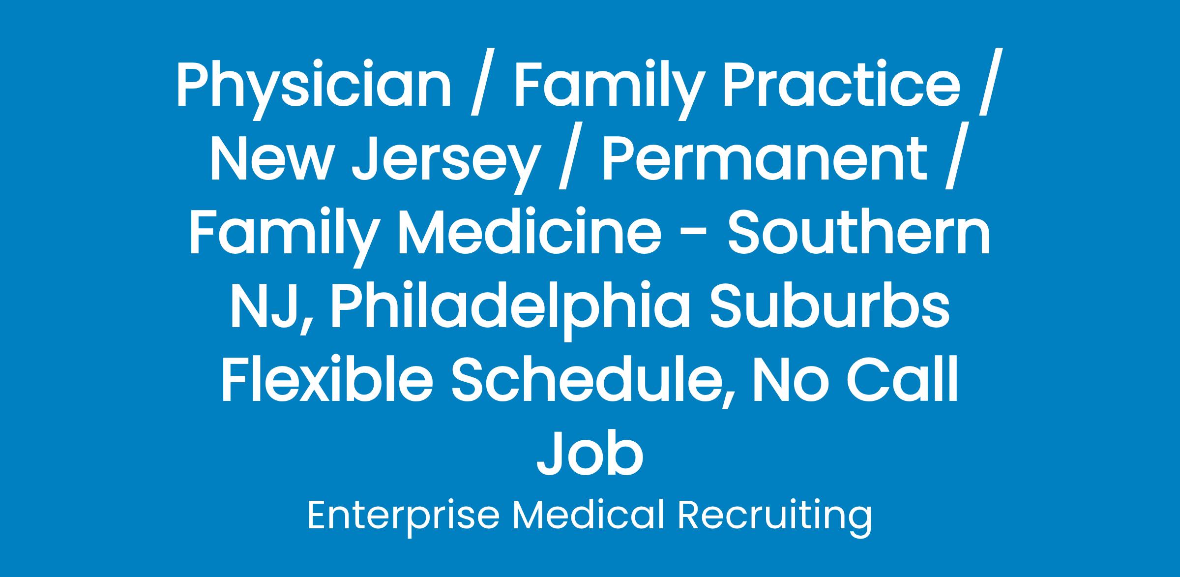 A boutique, private practice in Southern New Jersey, in the Philadelphia suburbs, is searching for a Family Medicine physician to help address patient demand. Enjoy a group where you?ll practice in a great, physician-friendly atmosphere with grateful patients. Quality first, supportive MAs, and no call.