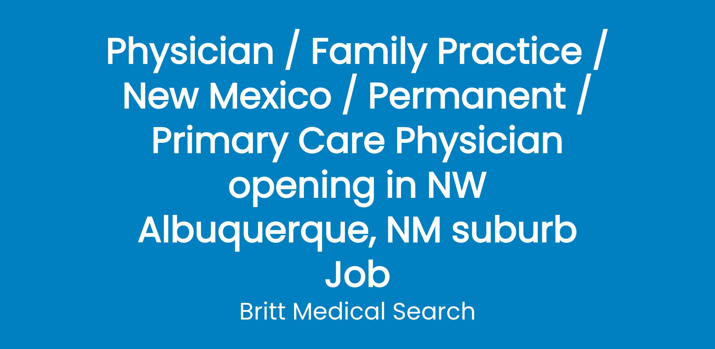 Seeking a BE/BC Family Medicine Physician to join an established practice in near Albuquerque, NM.