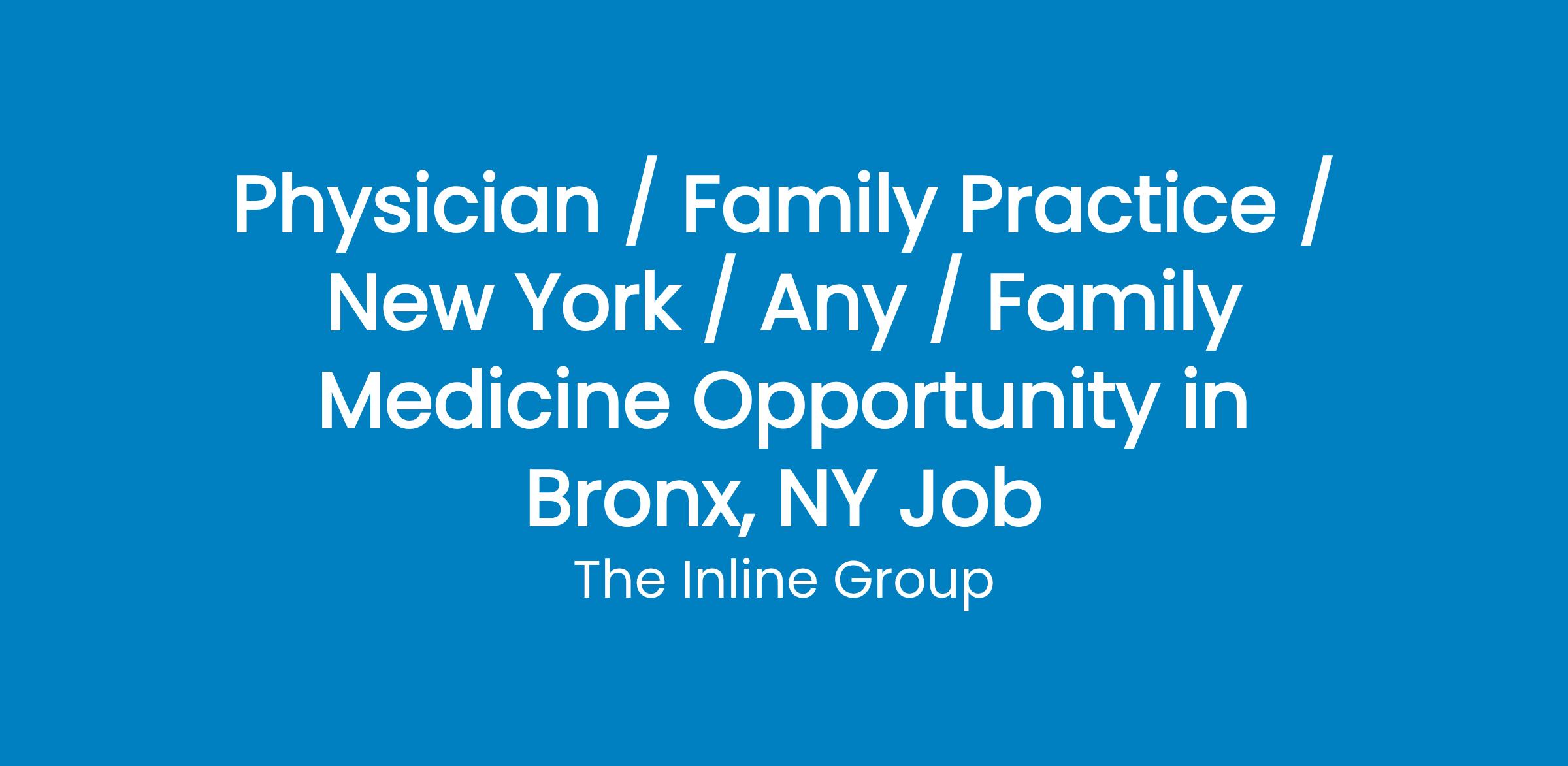 Additional Info: - Providers with experience in LGBTQ+ care encouraged to applyREQUIRED:- Board Certification in Family Medicine (New Grads have 6 month grace period) - Proficient utilizing EMRs: (They use Amazing Charts)- (REQUIRED) Must already have an active NY license JOB DETAILS:-New Riverdale practice within the Bronx community!-Constantly expanding and growing organization. Looking for a long-term career tract this is the place to find it!- Newborn, child, adolescent, and adult healthcare with an emphasis on disease prevention and health promotion.- Office-based procedures and diagnostic tests including EKG and spirometry, mole and wart removal, pap smears, IUD placement, and annual exams.- Time-efficient and well-managed scheduling, with limited over-booking.OFFERED:- We offer a collegial work environment with support for new graduates and the ability to build a personalized patient panel. - Assigned admin and medical assistants for each provider, every shift.