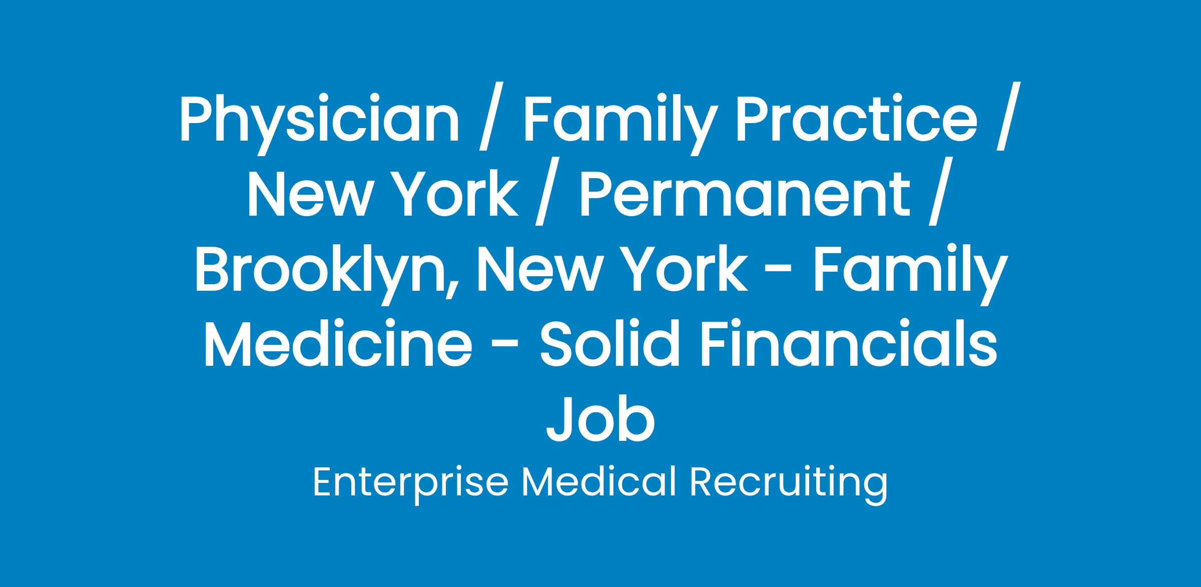 Enterprise Medical Recruiting is representing an established, busy physician-owned practice in Brooklyn, New York. They are currently seeking family medicine physicians to join their Brooklyn practice, which is experiencing significant growth.