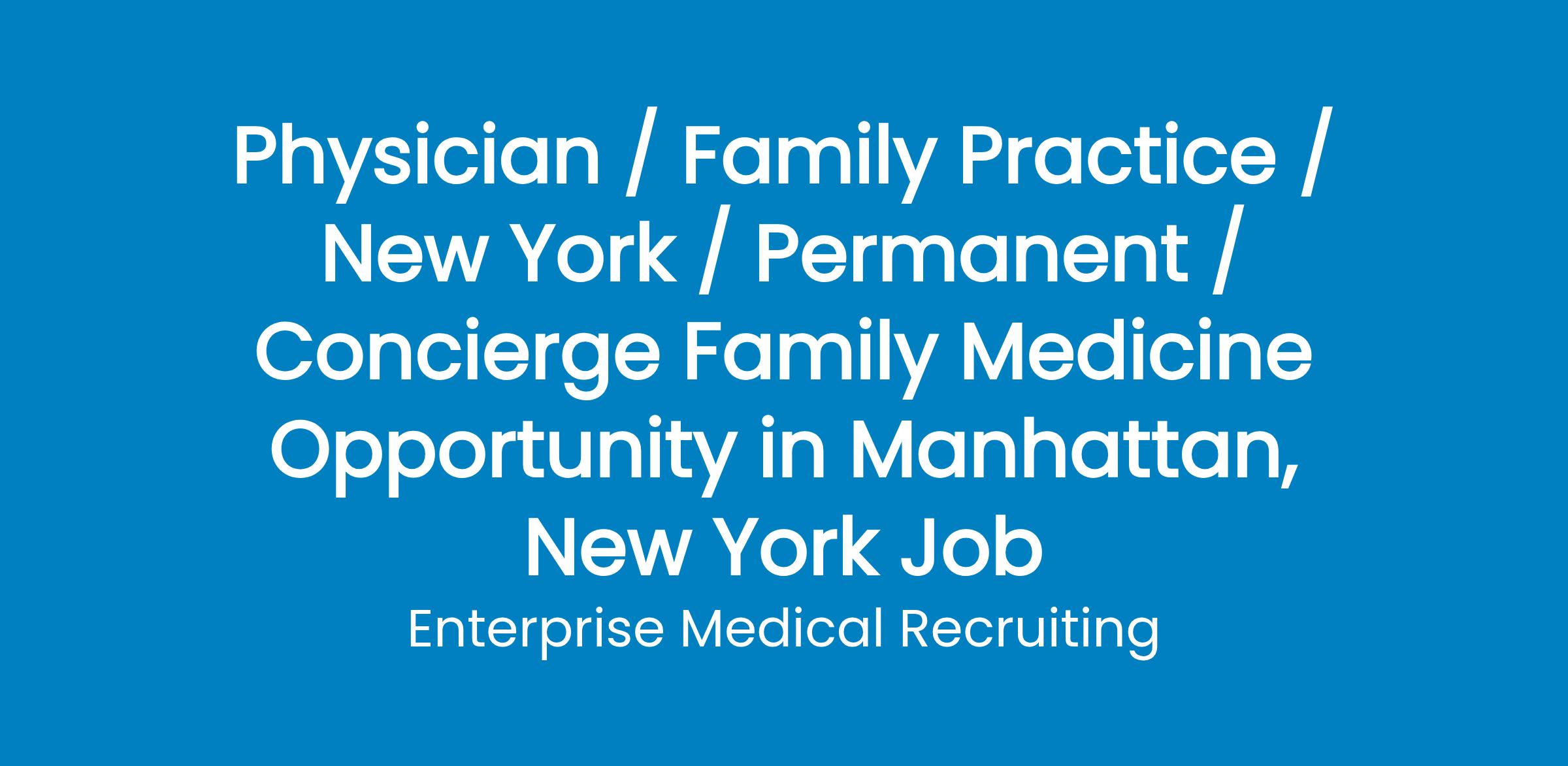Enterprise Medical is assisting a unique primary care group that delivers the highest-quality care and services in their search for Outpatient Family Medicine physicians to work in their primary care clinics in Manhattan and Purchase, NY. The position will serve the employees and families of those working for Morgan Stanley. The clinic will see patients over the age of 14.