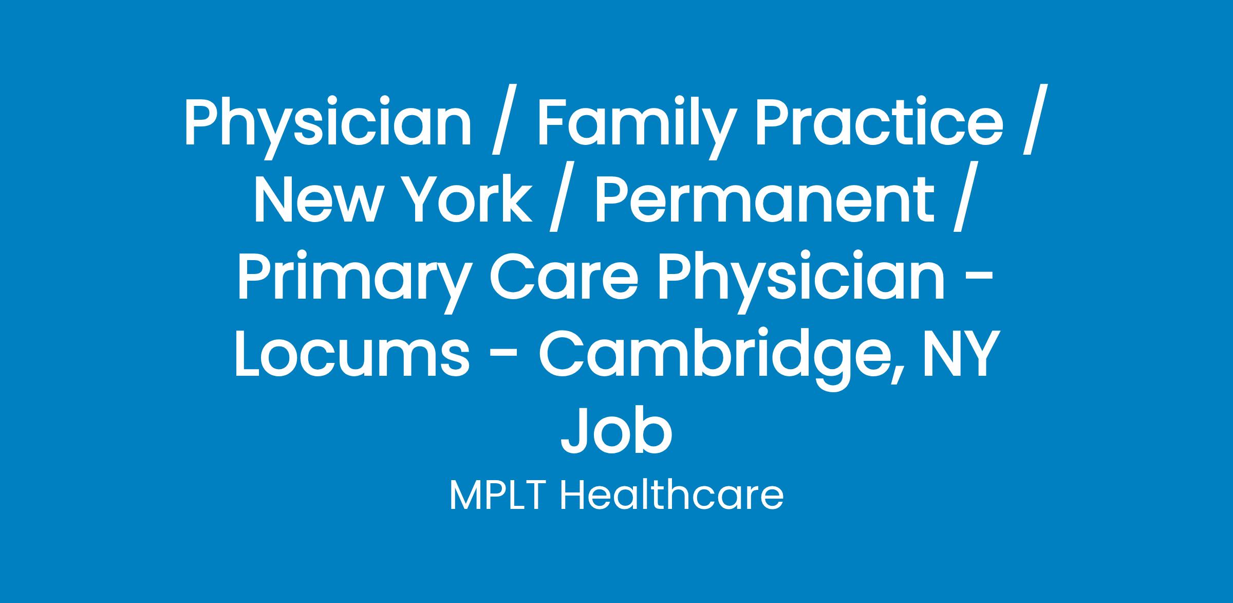 MPLT Healthcare is looking for physicians who Understand the Urgency, Never Give Up, and Have the Courage to Excel in the forever changing medical industry! We have numerous opportunities for an experienced Primary Care Physician with highly competitive pay rates in Cambridge, NY .