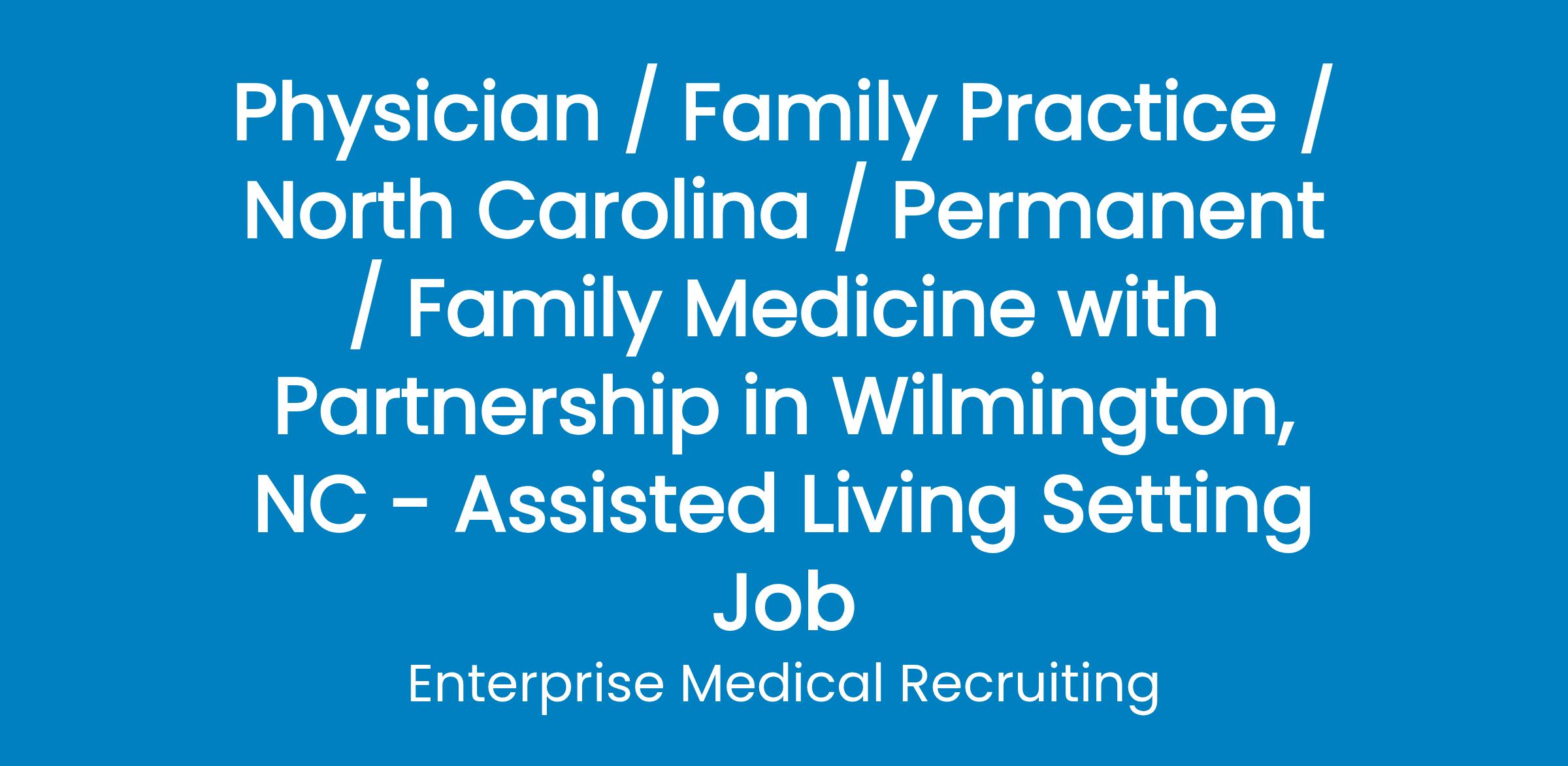 A well-established Long Term Care and Assisted Living group is seeking to add a Family Medicine physician to their private practice in Wilmington, North Carolina. The group consists of two internal medicine physicians and 10 advanced practitioners. The physician will see patients in an inpatient setting long-term care or assisted living setting.