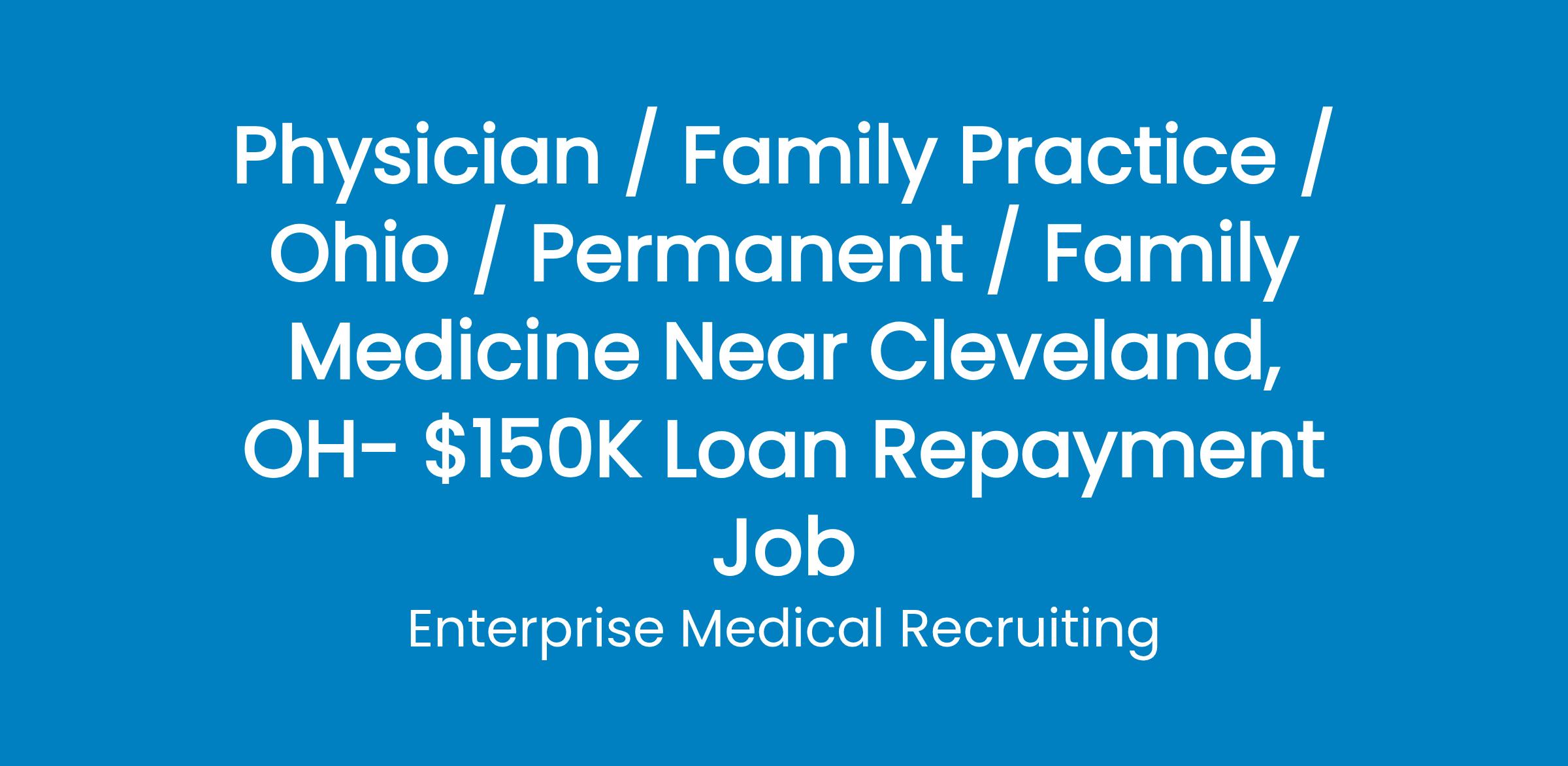A Hospital system located 30 miles west of Cleveland, has opportunitiesfor BC/BE Family Medicine and Internal Medicine Physicians to join busy outpatient practices. The system employs more than 100 providers.This hospital employment opportunity is for a physician interested in joining a dynamic group of physicians driven by our Mission to serve.