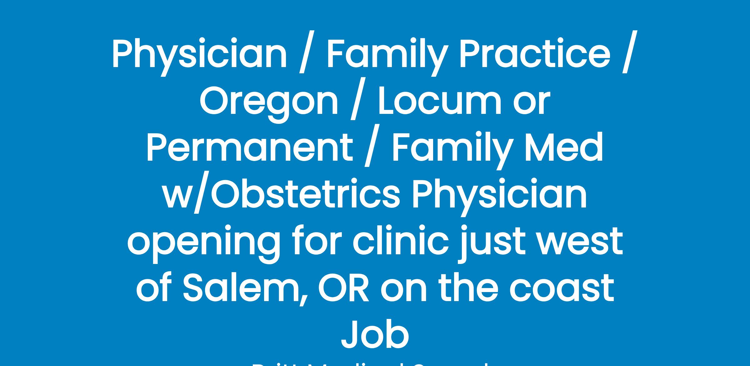 Seeking BE/BC Family Medicine w/Obstetrics Physician to join rural health clinic in coastal OR town, an hour west of Salem, that has been providing care to the community for almost 50 years.