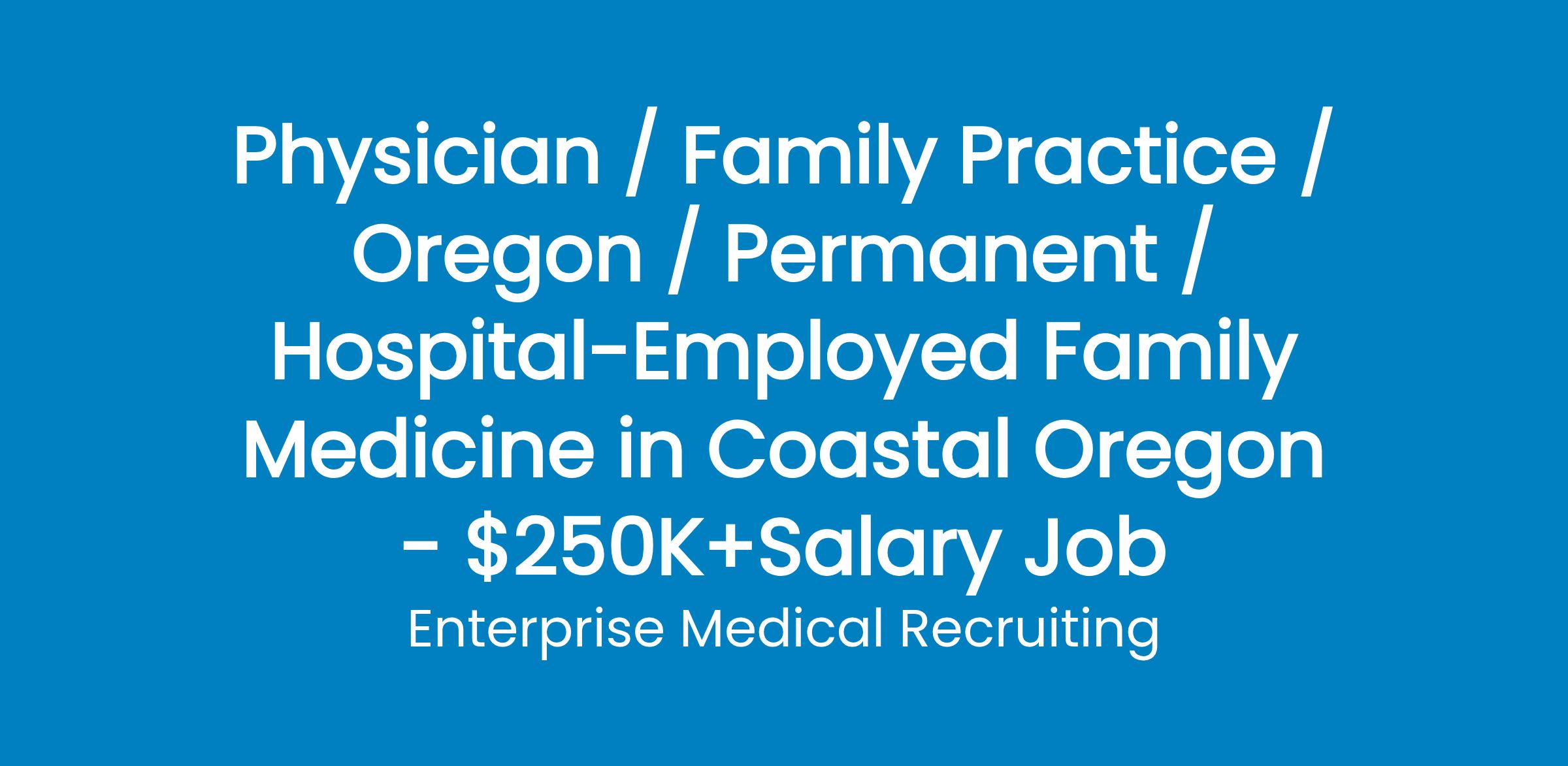 We are seeking a full-time, outpatient-only Family Medicine Physician for a clinic in beautiful, coastal Oregon. You will be joining a small team of internal and family medicine physicians and nurse practitioners.