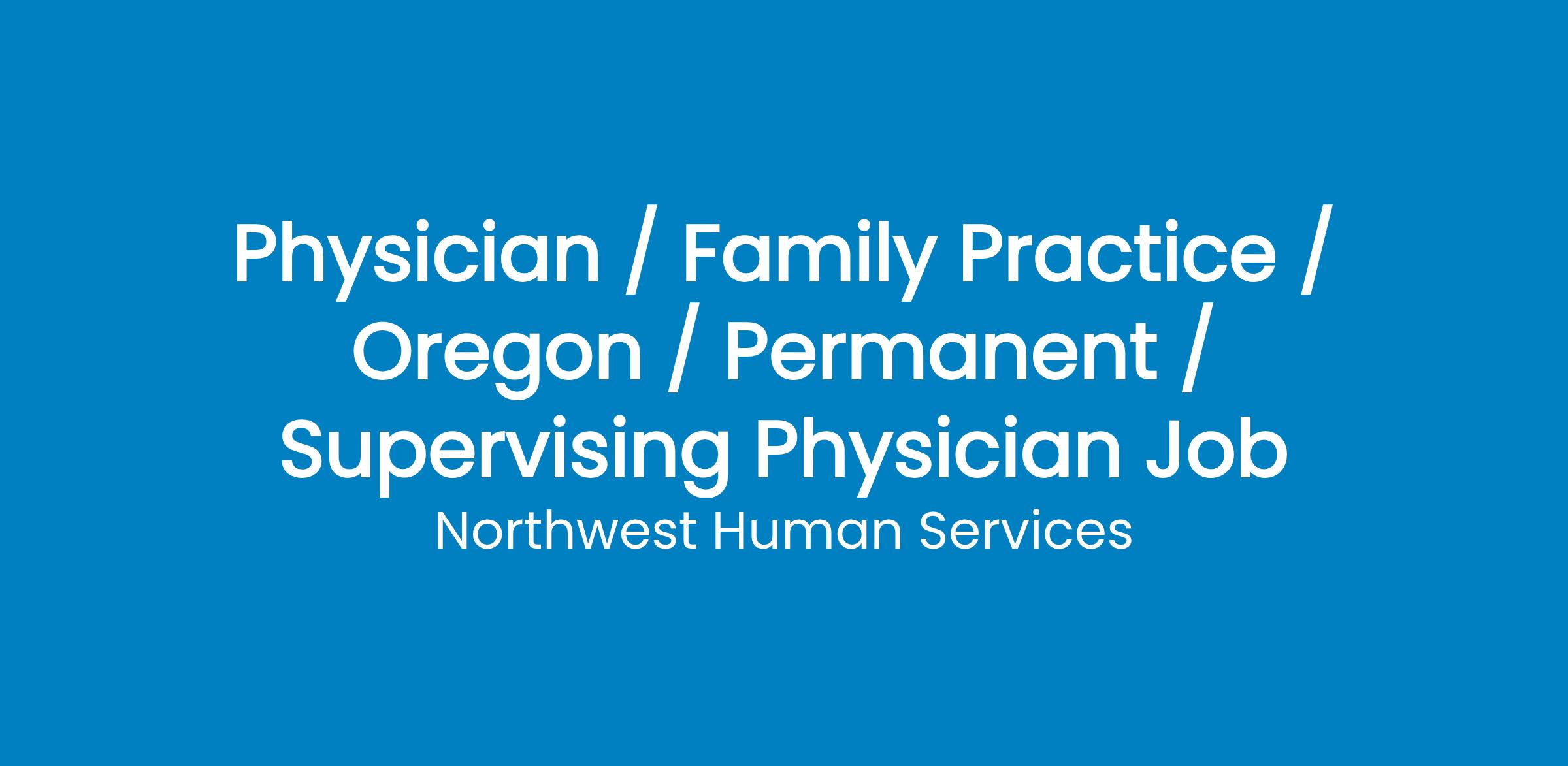 Are you an experienced Physician with a passion for teaching? Do you have skill and knowledge youd like to pass on to other care providers? Northwest Human Services is a Tier III Patient Centered Medical Home and FQHC located in Salem, Oregon. We are seeking a supervising physician to oversee, mentor, and supervise several Physician Assistants managing individual panels of 1500 patients. This person will be responsible for proctorship, consultation, and documentation oversight of assigned mid-level providers and will act as the first physician for clinic staff. This is a full-time position that includes patient care responsibilities in a busy family practice.