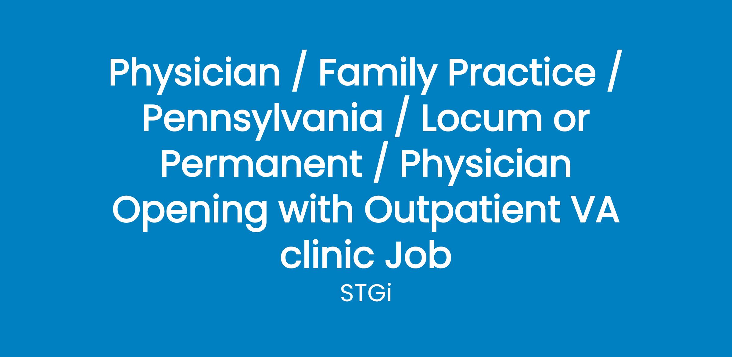 STG International has an immediate need for an Internal Medicine or Family Medicine physician to provide support and primary care to military Veteran patients at our Community Based Outpatient Clinic (CBOC) in Pottsville, PA. As a physician or Medical Director at one of our Community Based Outpatient Clinics, you would create a welcoming experience for our military Veterans that have served our country. Provide medical care based on primary and preventative care to meet the needs of the patient. Enjoy regular hours (M-F 8-4:30) with no weekends, and no after-hours call. 90 miles northwest of Philadelphia, PA. Roughly an hour to the Hershey-Harrisburg area.Requirements Include: Possess a Doctor of Medicine or Doctor of Osteopathic Medicine from an accredited school in US or internationally.Candidates must have successfully completed a residency program in Family Practice or Internal Medicine with recognition by the American Board of Medical Specialties or the American Osteopathic Association. Current and unrestricted DEA.Retain current Cardiopulmonary Resuscitation (CPR)/ Basic Life Support (BLS) from the American Heart Association (AHA) or the Military Training Network (MTN).Knowledge of and ability to apply professional medical principles, procedures, and techniques in accordance with the community and VA standards of practice.Oversee all day-to-day delivery of medical care to patients.Minimum of one year experience as a licensed physician. STG International offers a generous salary and bonus, competitive benefits package which includes Medical, Dental, Vision, 401k with company match, PTO, CME time and allowance, and more. If you are interested in learning more about this and other opportunities, please email or call ext. 366. You can also visit our website at to review careers with us.