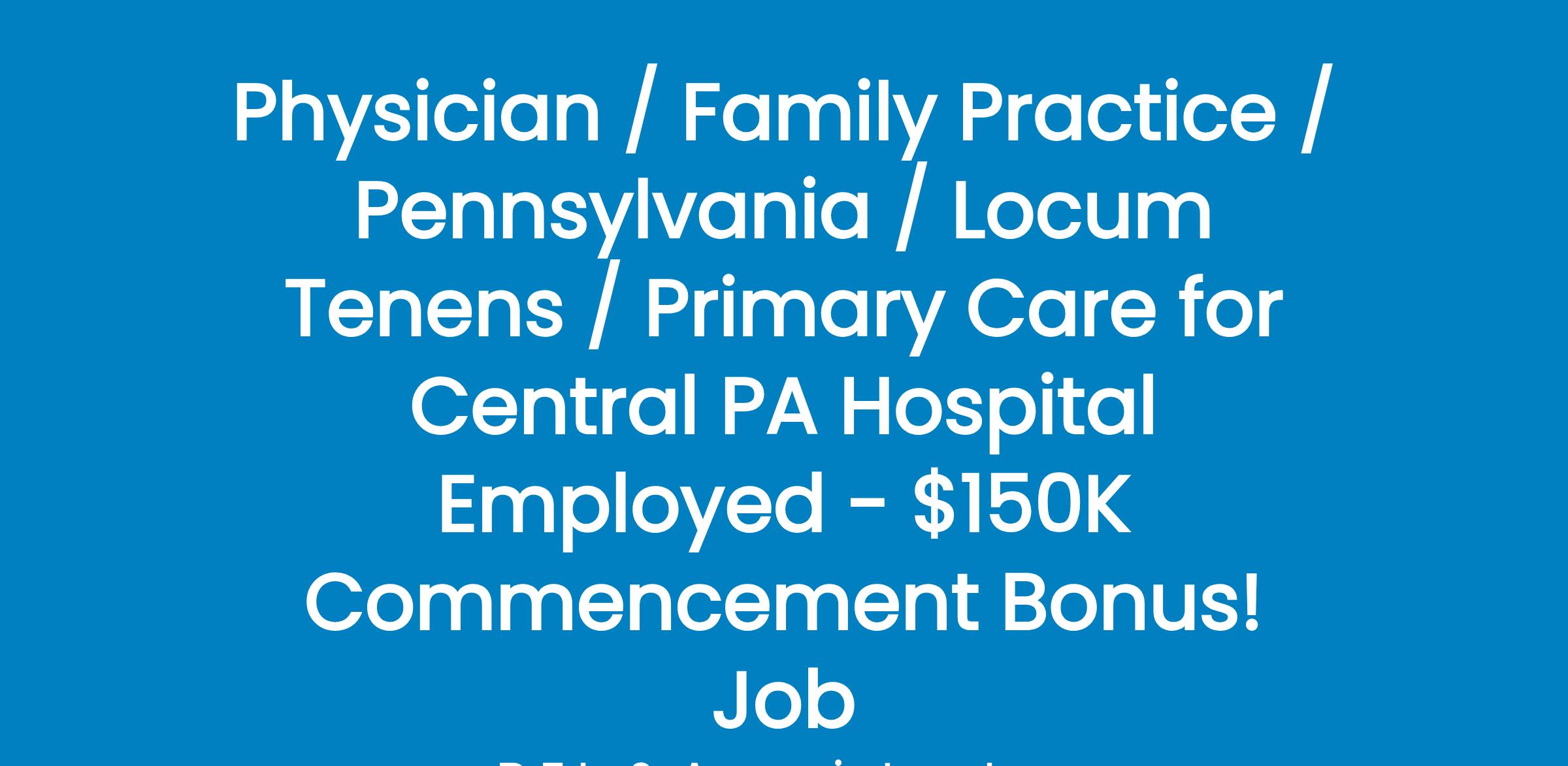 Seeking Board Eligible/Certified Family Medicine or Internal Medicine Physician for outpatient position in Central PA, outside of Scranton. Teaching available. Excellent opportunity with $150K Commencement Bonus + $100K retention bonus over 5 years.
