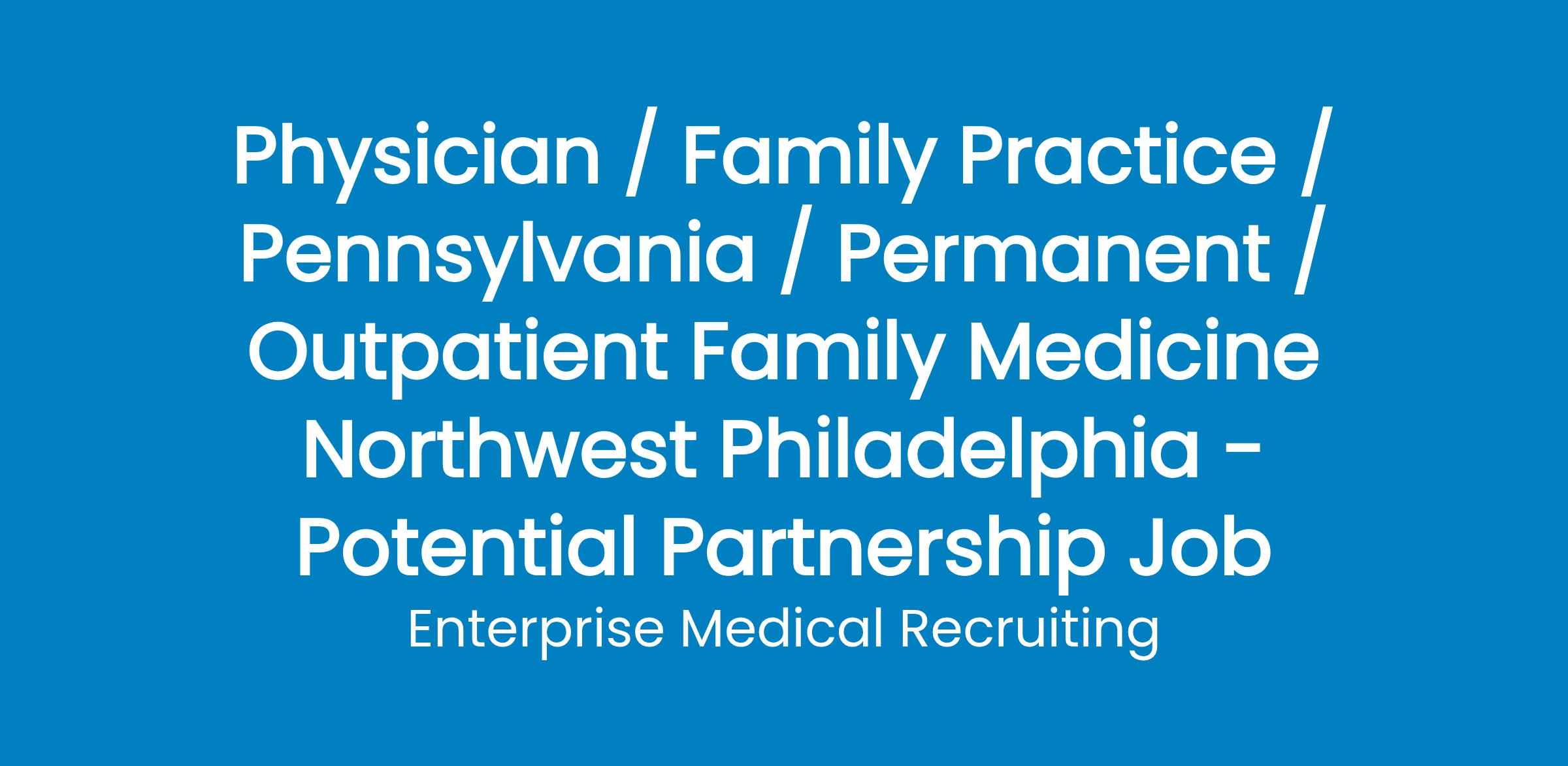 A physician-owned and physician-run group is seeking a Family Medicine physician to work in an outpatient practice in Northwest Philadelphia, Pennsylvania.