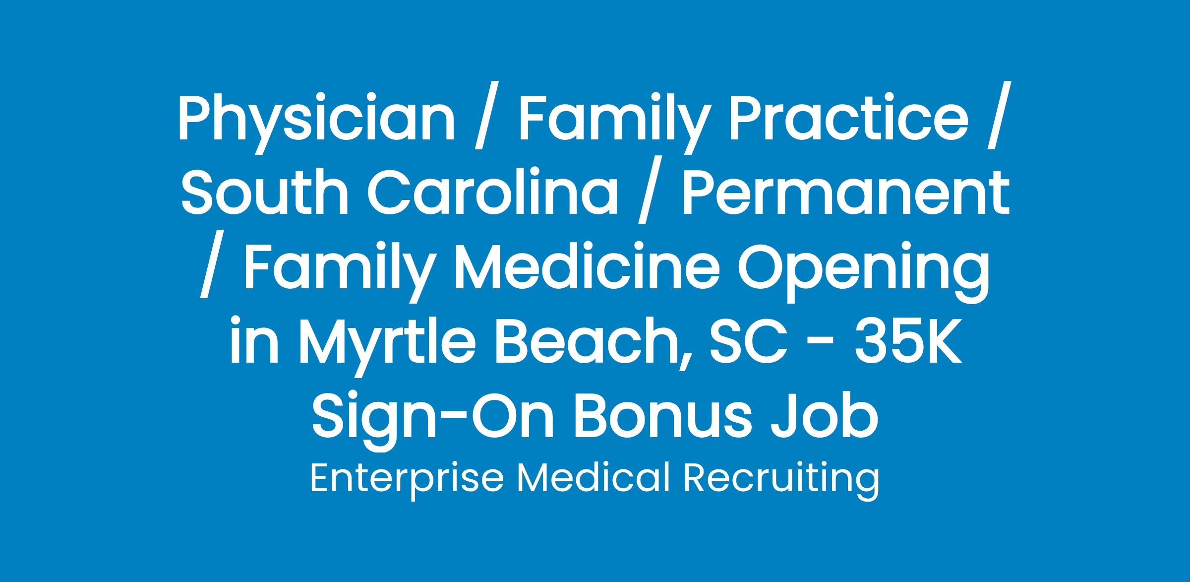 Seeking a Family Medicine physician for an outpatient clinical role in Myrtle Beach, South Carolina. Provide comprehensive care for patients of all ages, focusing on preventive care, chronic disease management, and acute care services.
