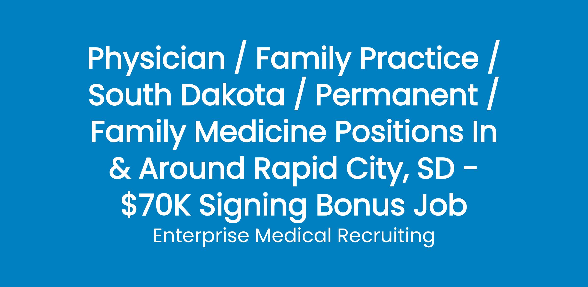 Seeking BE/BC Family Medicine physicians to join a well-established Family Medicine practice in 3 locations surrounding Rapid City, South Dakota. These beautiful locations in the Black Hills of South Dakota are an outdoor lover's dream. Tons to do like hunting, fishing, hiking while surrounded by breathtaking views.