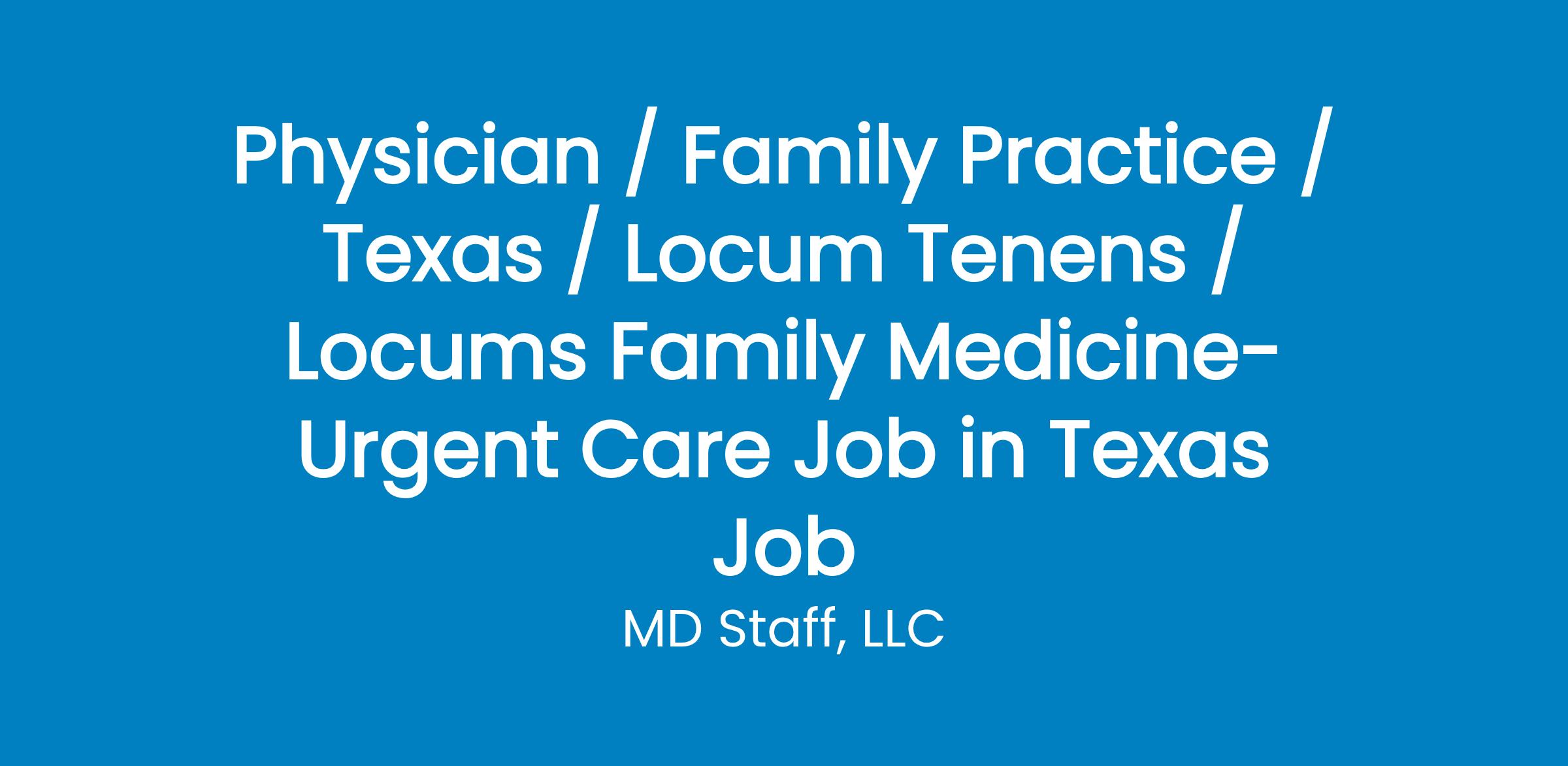 Exciting Locum Tenens Opportunity: Urgent Care - Family Medicine Physician in Texas Are you a skilled and dedicated Family Medicine Physician with expertise in Urgent Care, seeking a rewarding locum tenens assignment? We have a fantastic opportunity for you to join our team in the great state of Texas, serving the vibrant community near Morton. Assignment Details: As we navigate a temporary medical leave, we are actively seeking a qualified Family Medicine Physician to cover the urgent care needs in our community. Here are the details of this exciting locum tenens opportunity: Specialty: Family Medicine - Urgent Care Department: Urgent Care Start Date: 03-01-2024 End Date: 05-31-2024 Reason for Coverage: Vacancy due to Medical Leave Schedule: 7AM-7PM; 7 on/7 off Board Certification Requirements: ABIM On-Call: No Patients Per Shift: 45-50 Practice Setting: Outpatient Admissions Required: No Locum Type: Locum Tenens Practice Details: The urgent care clinic operates daily from 10 am to 10 pm, providing essential healthcare services to the community. The requested coverage involves 16 shifts of 10 hours each per month. The shifts are strategically distributed throughout the week, offering flexibility and accommodating various preferences: Provider Requirements: Board Certified in Internal Medicine or Family Medicine (Eligible also accepted) Hospitalist experience is not required; procedures are not required Location: This exceptional opportunity is located near Morton, TX, providing a supportive and welcoming environment for both work and personal life. Benefits: Competitive compensation Lodging recommendations provided Supportive community with country club amenities Leadership opportunities available Comprehensive insurance provided by the vendor Welcoming community, ideal for achieving work-life balance How to Apply: If you are interested in exploring this exciting locum tenens opportunity further, please contact us via the following methods: Phone: Call or text MD Staff at . Email: Reach out to us via email at . Reference Job ID: Please reference Job ID # j-183416 in your correspondence. Join us in providing exceptional care and making a meaningful impact on the health and well-being of the local community. We look forward to hearing from you and having you contribute to our team near Morton, TX. Embark on a rewarding locum tenens experience where your skills and dedication positively impact urgent care services in a welcoming Texas community.