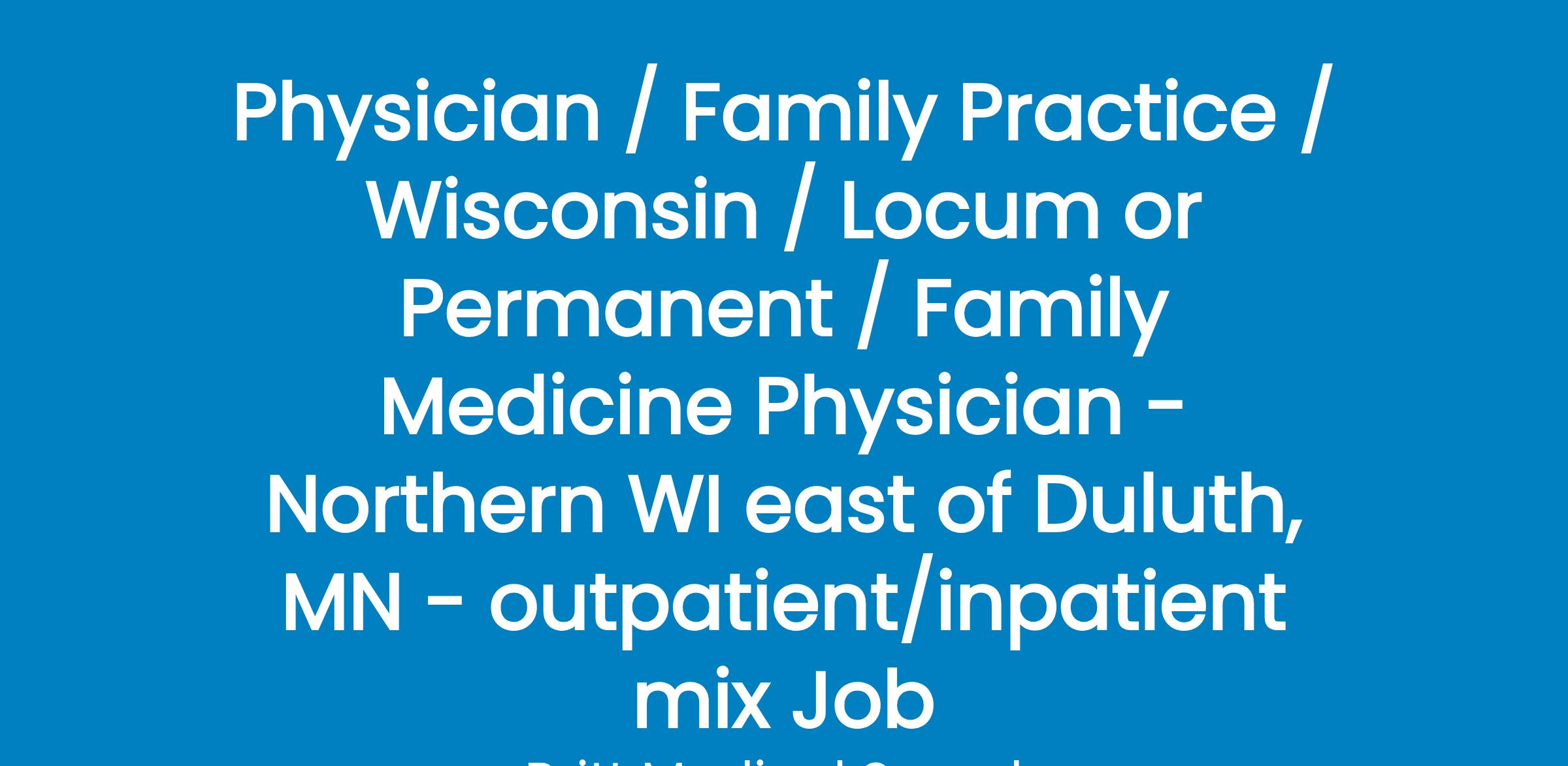 Seeking BE/BC Family Medicine physician to join talented team in beautiful northern Wisconsin on Lake Superior.