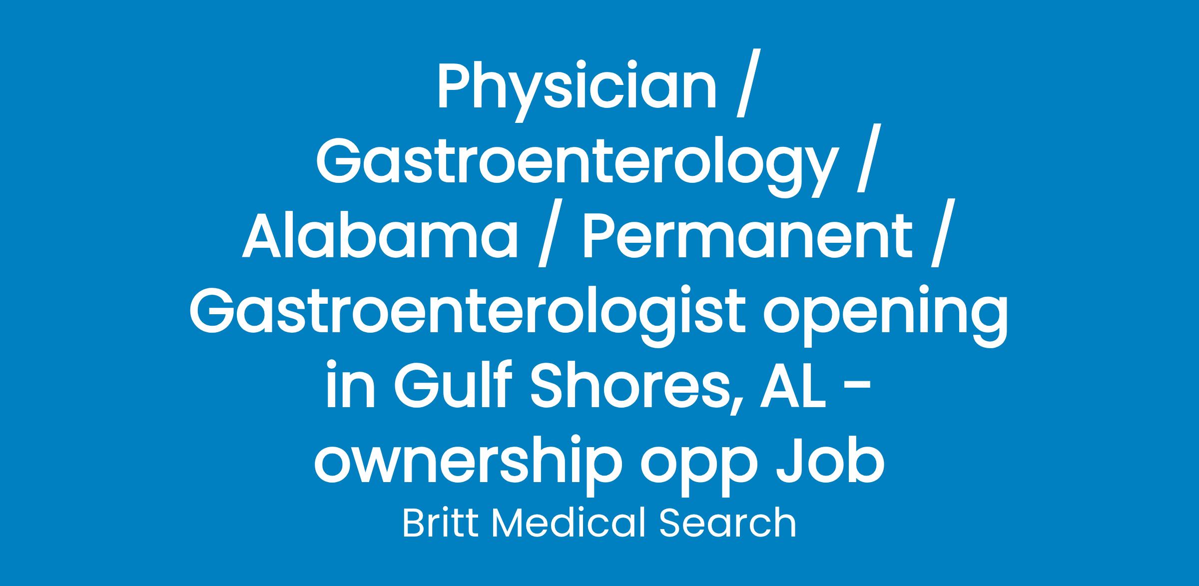 Physician / Gastroenterology / Alabama / Permanent / Gastroenterologist opening in Gulf Shores, AL - ownership opp Job