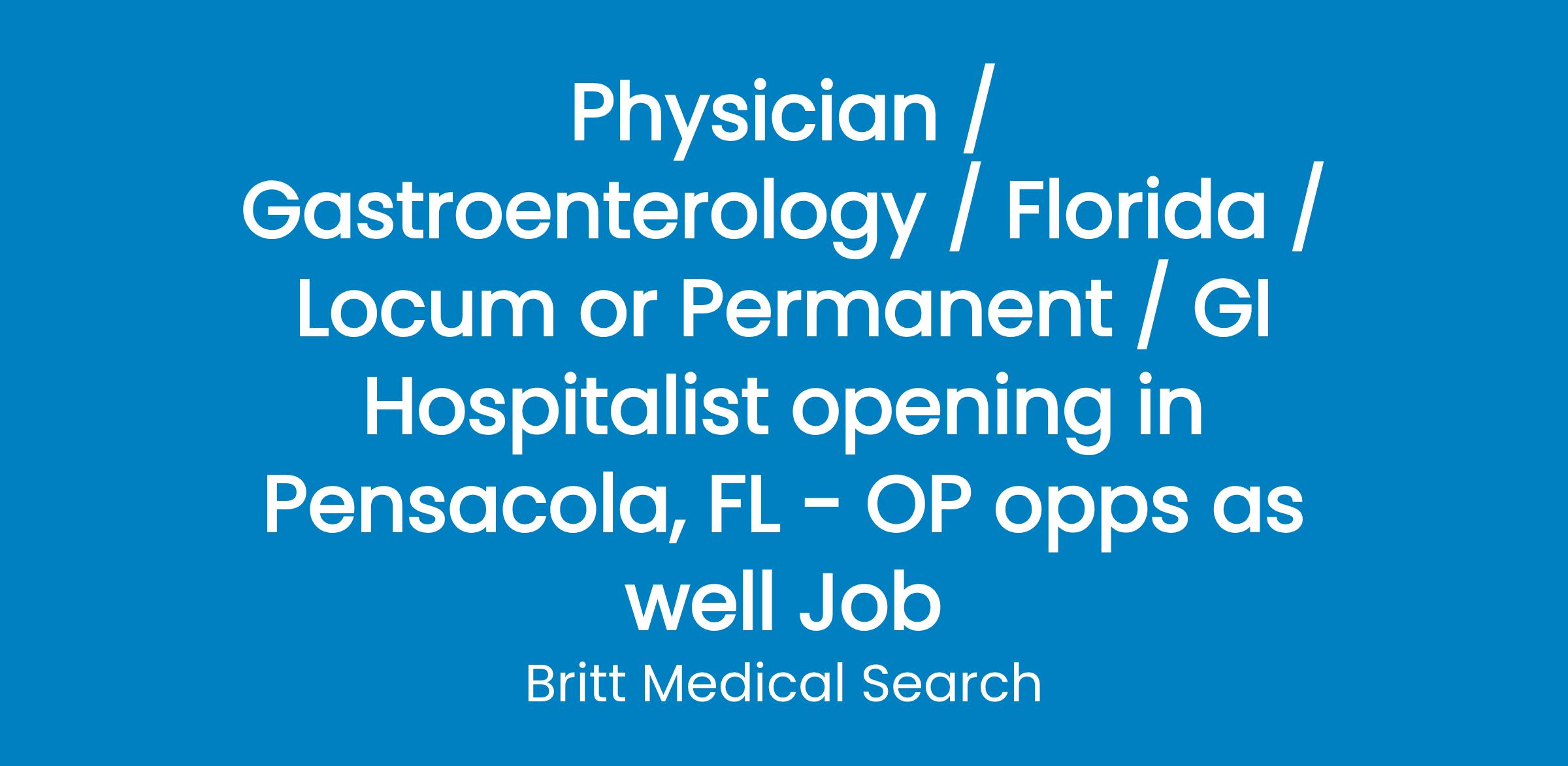 Seeking a GI Hospitalist to join team that also offers an opportunity to also maintain an occasional OP clinic. This position offers a perfect work life balance in this beautiful coastal location of Pensacola, FL. This is primarily Monday through Friday, days only, with approximately Q5 rotation for nights and weekends that will afford you that perfect opportunity to enjoy this thriving beach community!