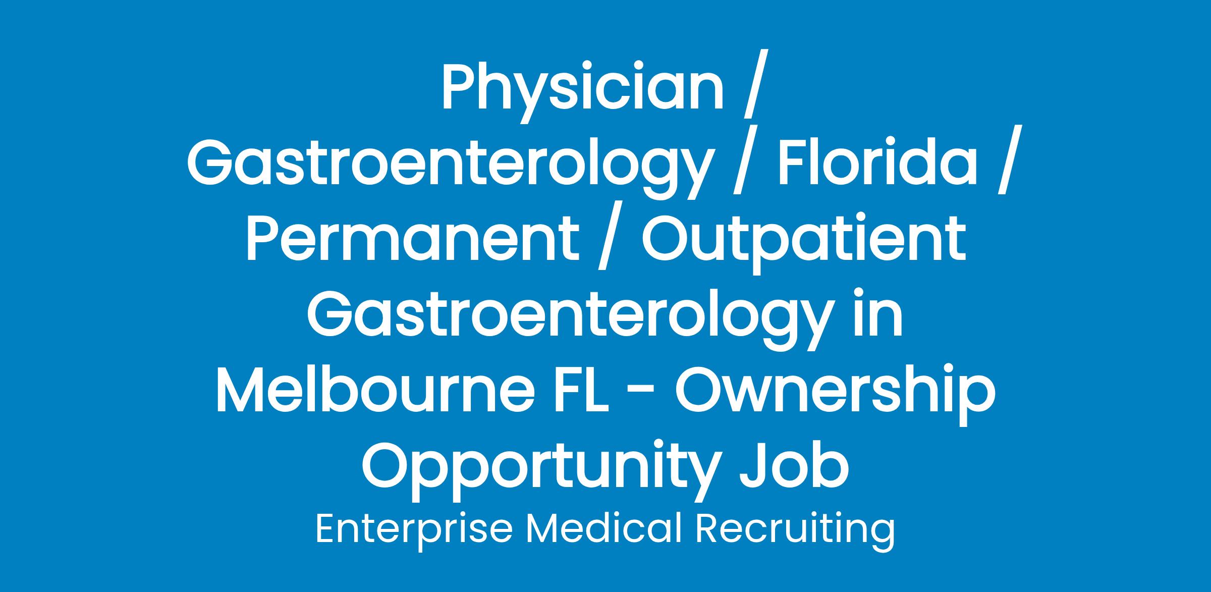 Enterprise Medical Recruiting is assisting a Health System in Melbourne, Florida, in recruiting a new Gastroenterologist. This is an outpatient-based practice, with both clinic and ASC time dedicated weekly.