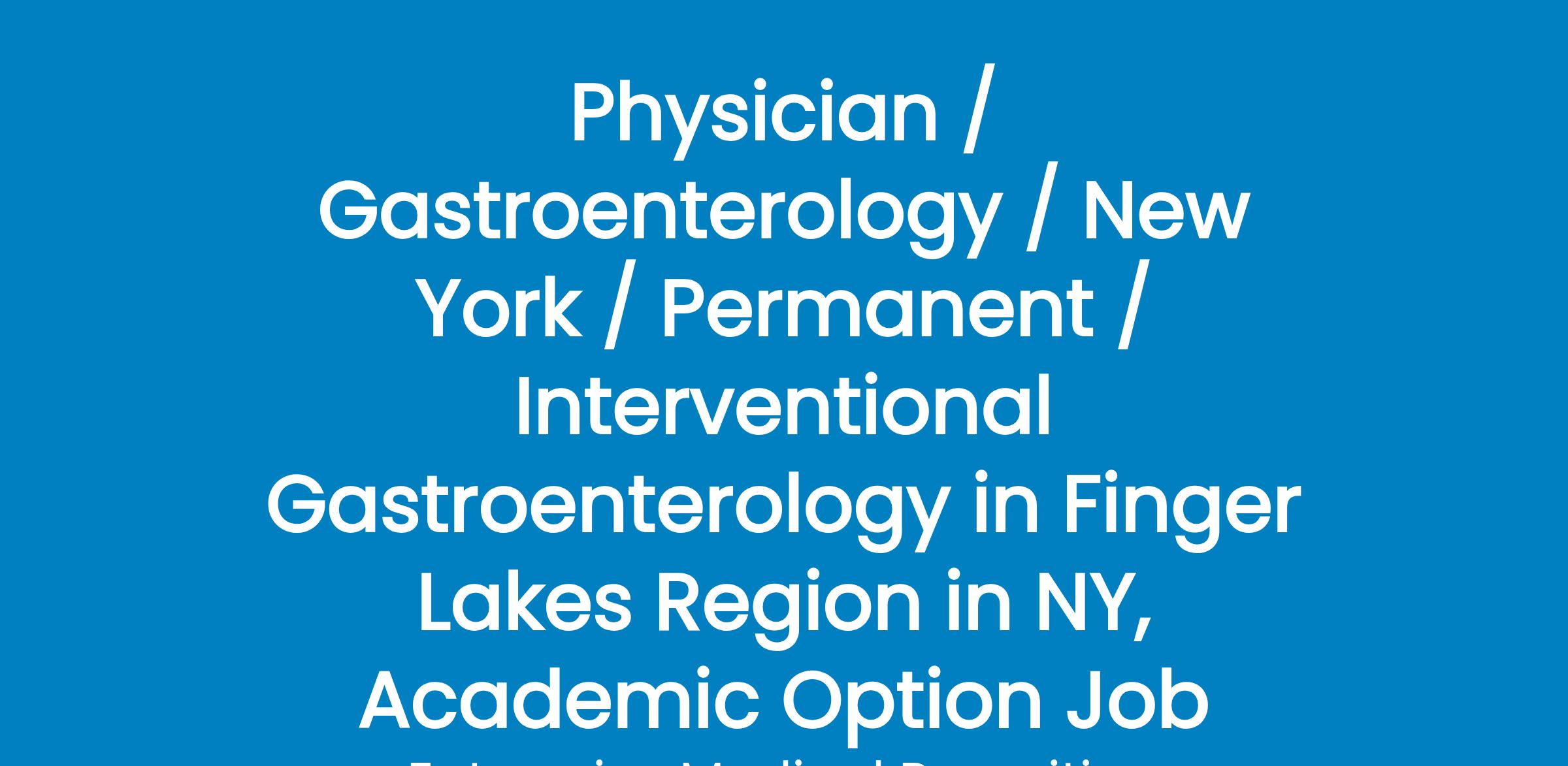 A large, physician-led multi-specialty group in the Finger Lakes Region of Upstate NY is adding an Interventional Gastroenterologist to its expanding practice to help develop a regional Gastroenterology Center of Excellence. This is an excellent opportunity to make a significant impact in the community.