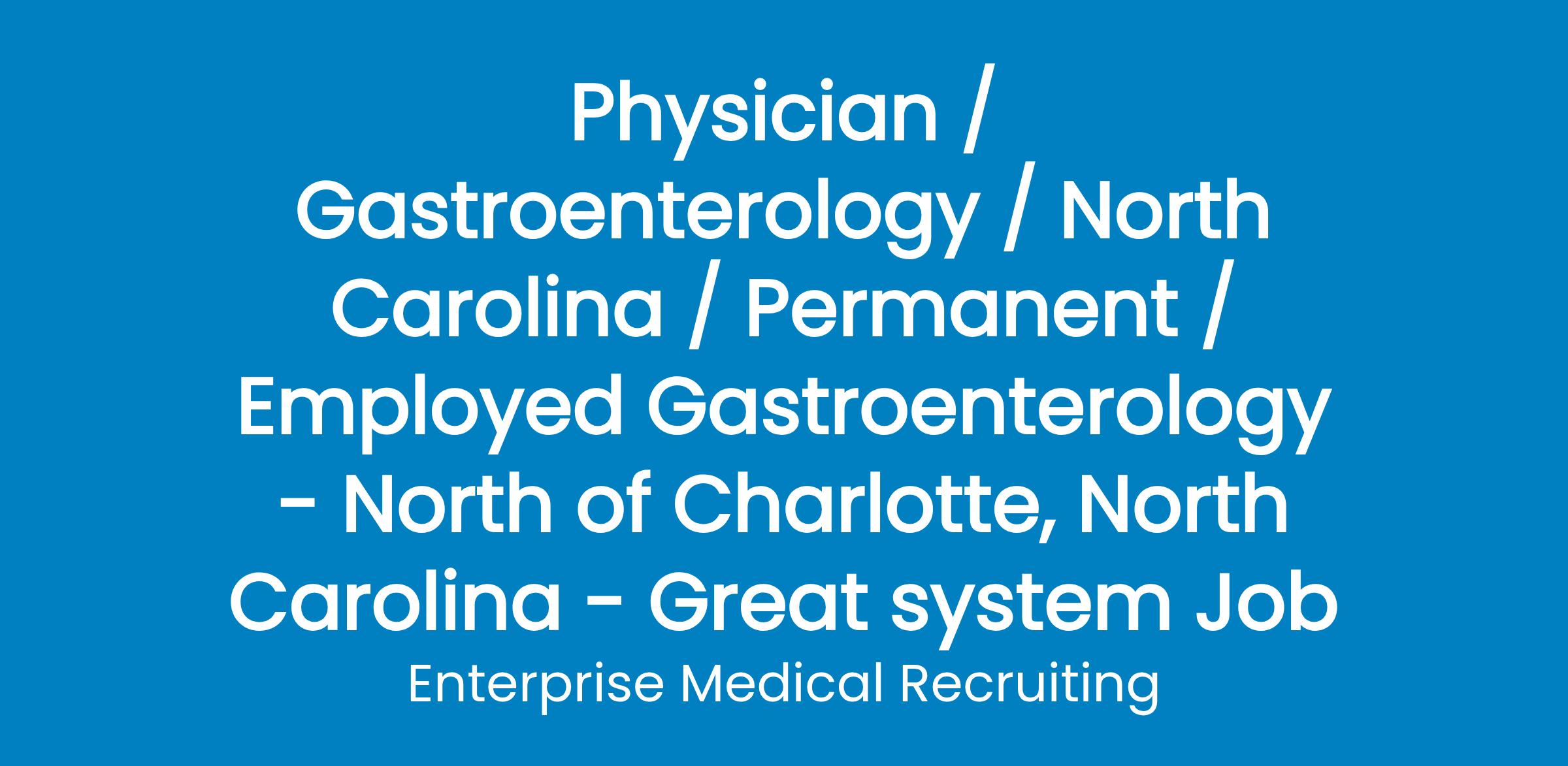 Enterprise Medical Recruiting is assisting a group practice in North Carolina, about 40 minutes north of Charlotte, to recruit a new Gastroenterologist. This is a 4 person group with 4 Advanced Practice providers as well. It will be a bread-and-butter GI practice, but candidates with an interest in IBD/IBS and ERCP skills are welcome!