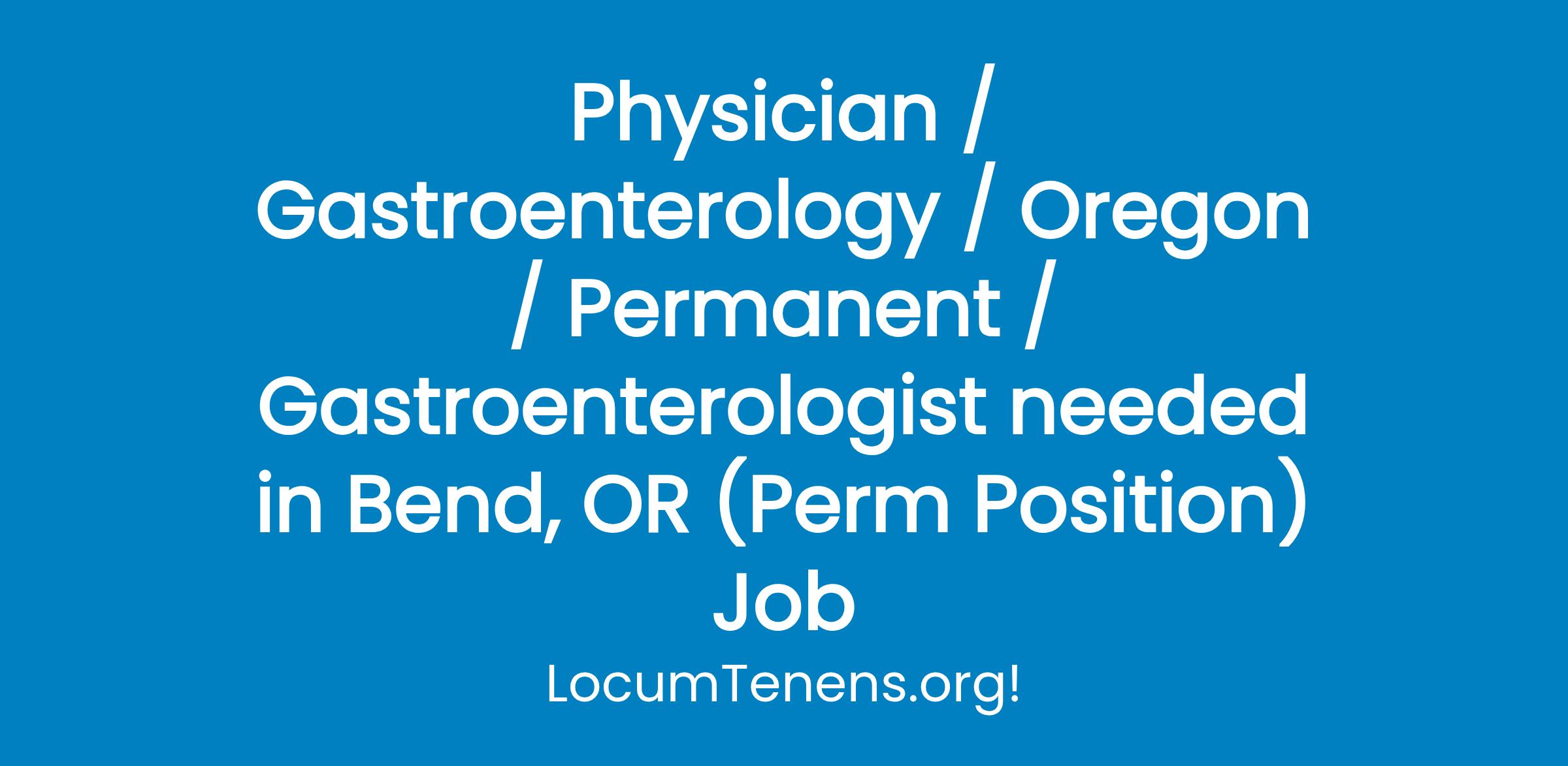 Gastroenterologist needed in Bend, OR (Perm Position)A physician led and professionally managed medical group where providers drive strategy, vision and project implementation.4 other GI physicians and 3 APP'sBusy practice, high demand for GI services and lots of growth potentialAdvanced Practitioners assist with providing hospital and clinic coverageRounding at one community hospitalScopes performed at a new, efficiently run surgery centerERCP preferred but not requiredMarket leading compensation rates with high earning potential and a quality bonus programShareholder opportunity with additional compensation upsideEasy access to resources, coding, and IT support utilizing the Epic platformBenefits of working within a growing multispecialty medical practice:Coordination of care with a large primary care base, surgical oncologists, general surgeons, oncologists, urologists, infusion services and most other subspecialty care.Comprehensive support teams for insurance authorization, billing, IT, HR, etc.Onsite laboratory, radiology, and other services BC/BE, OR license, BLS, DEA and COVID vaccine required