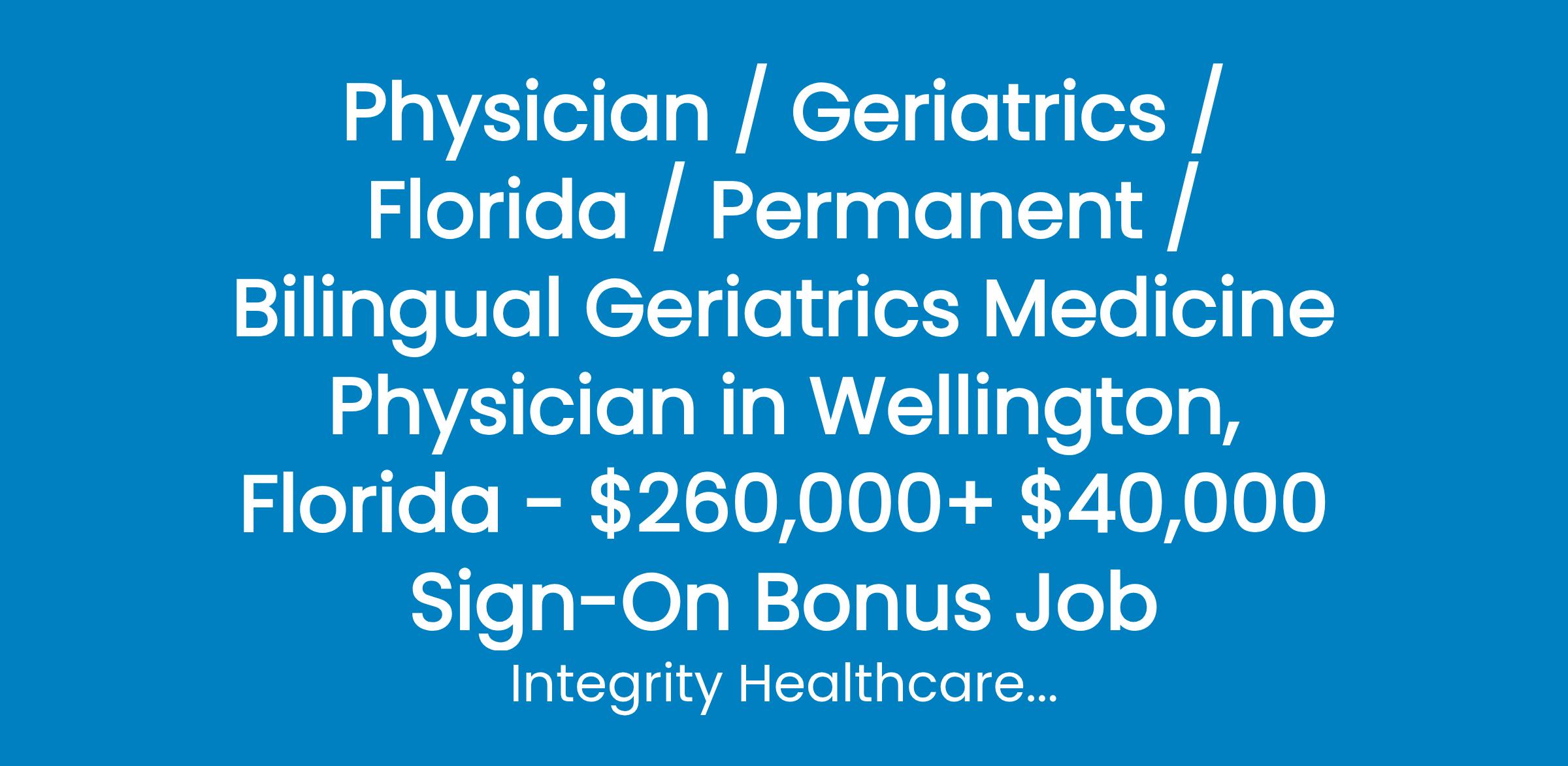 Physician / Geriatrics / Florida / Permanent / Bilingual Geriatrics Medicine Physician in Wellington, Florida - $260,000+ $40,000 Sign-On Bonus Job