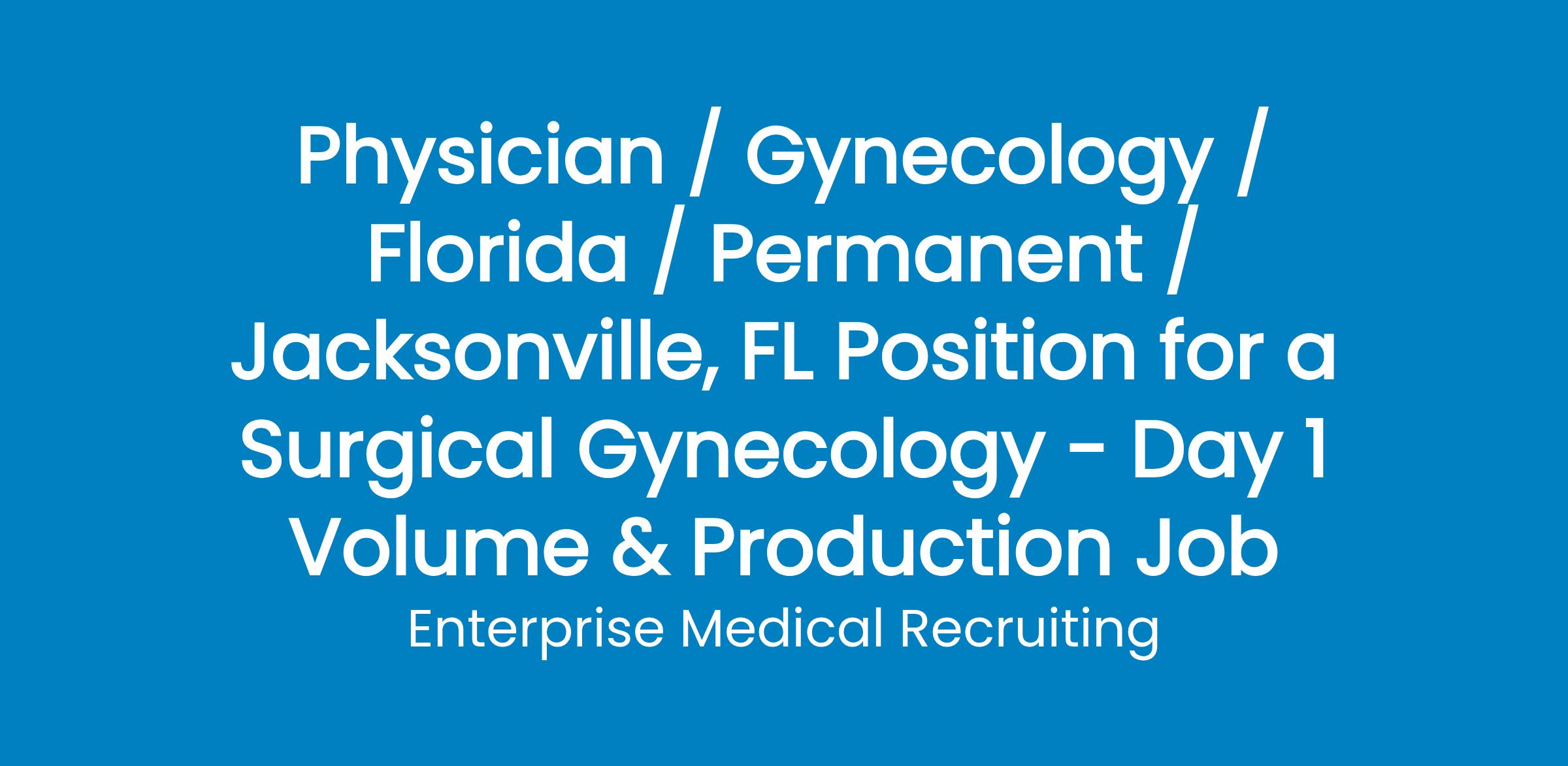 A highly-trained team of reproductive & fertility specialists in Jacksonville, Florida, has an ideal surgical Gynecology opportunity (no OB) where you will be busy right from the start!