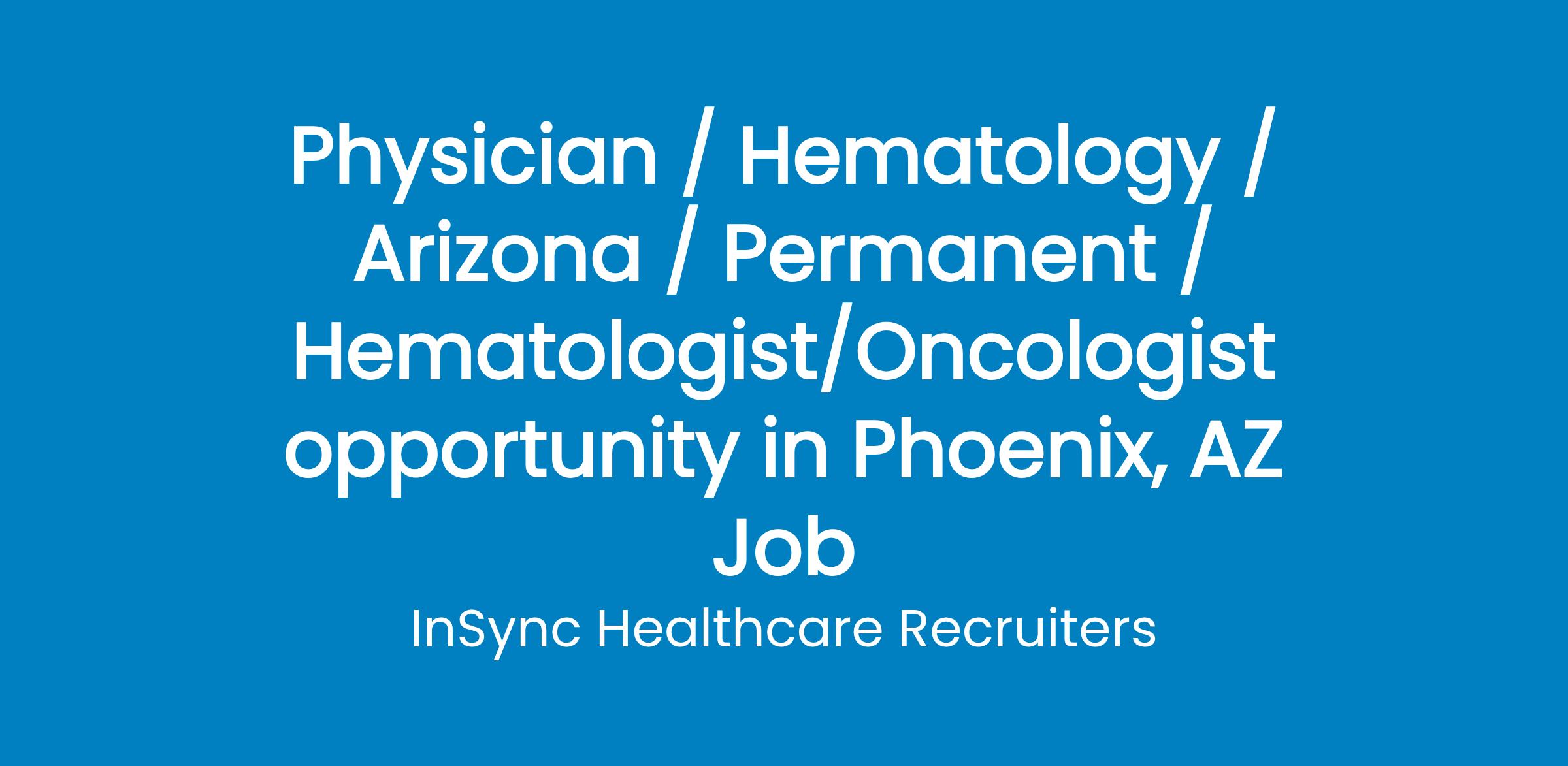 Wonderful full-time opportunity for Board Certified/Eligible Hematologist/Oncologist to join well-established academic medical group in Phoenix, AZ.This highly regarded multi-specialty group is exclusively contracted to provide patient care and teaching for a safety-net health system serving one of the largest counties in AZ. This is a not-for-profit faculty practice plan owned and operated by physicians consisting of more than 400 providers representing all major medical and surgical specialties and subspecialties. The physicians hold faculty appointments and participate in inter-professional teaching through the Creighton University Arizona Health Education Alliance with a fully accredited ACGME General Surgery Residency.Offering a competitive salary as well as a comprehensive benefits package including:Medical/Dental/Vision/Life/Disability/Supplemental LifePaid Time OffCME Allowance with paid time offRetirement and 401k BenefitsFlexible Spending AccountsPaid medical malpractice insurance w/tailExperienced Physicians and New Graduates are encouraged to apply. Must obtain an Arizona Medical License prior to beginning employment.Experience the Southwestern lifestyle in Arizona, offering an affordable cost of living, year-round warm weather, and a plethora of outdoor activities such as hiking, biking, fishing, camping, and golf. The vibrant Phoenix metropolis provides diverse social and cultural activities, including theatre, professional sports, symphony, and numerous museums celebrating the culture, history, and beauty of the Southwest.Job# RBAZHEMONC2300For more information, please email your updated CV to or call/text .