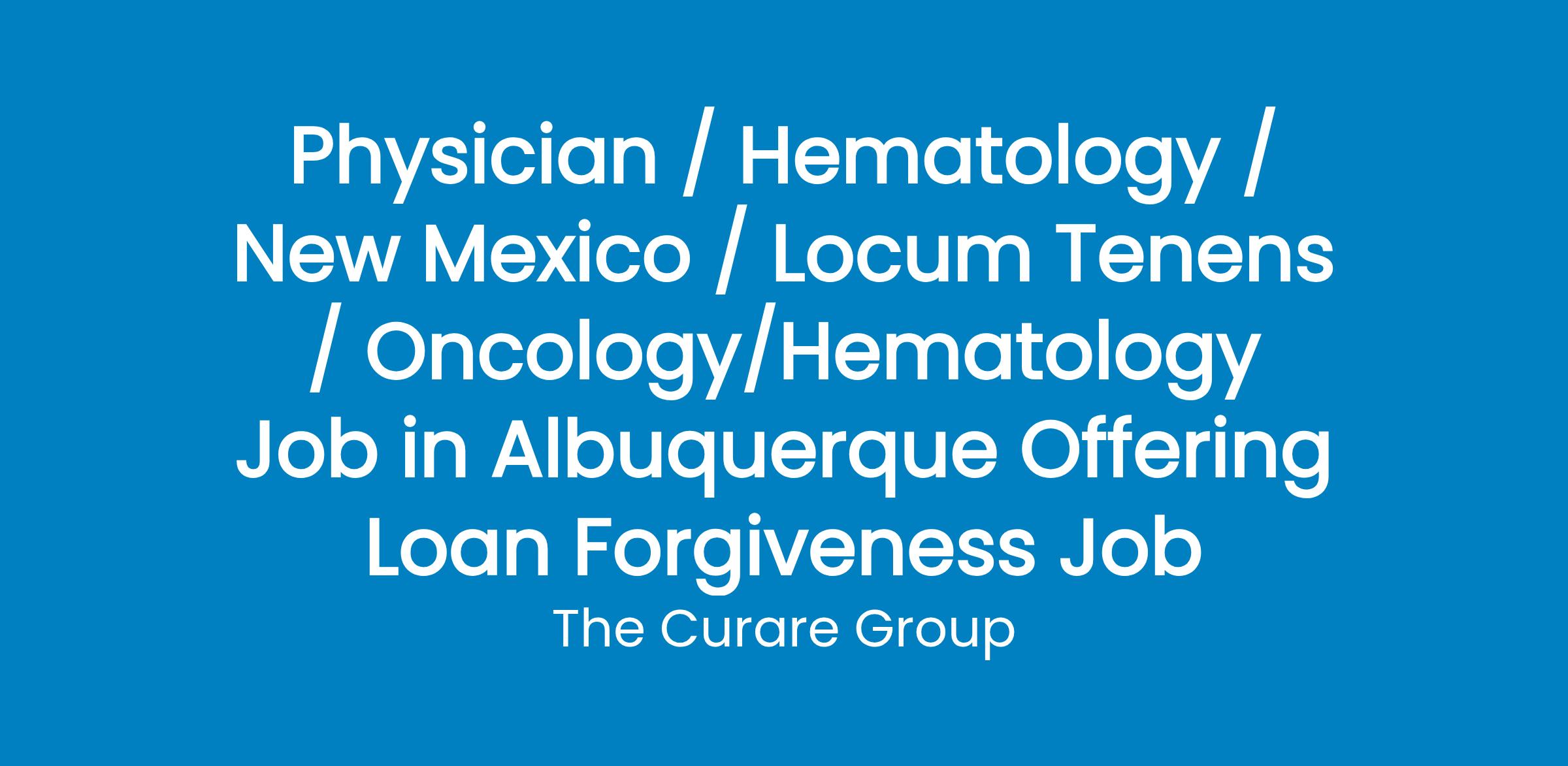 Some of the most picturesque scenery, and some of the most unique food experiences in the nation are waiting. A highly desirable New Mexico metro is seeking a Board Certified Hematologist/Oncologist to join a local practice. Warm weather year-round and big city amenities make for a pretty, happy life. Call today!Hospital Employee, Outpatient with call. Competitive Annual Salary. Loan Forgiveness possible. Signing Bonus available, contact us for details. Relocation Bonus available. CME time and money available.