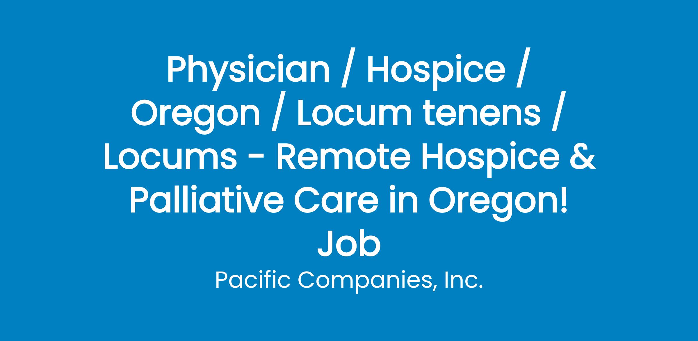 New Job Details Hospice & Palliative Care (Telemedicine)Location: Oregon (Remote position)Duration: ASAP - OngoingSchedule: Full time preferred, will consider 2-4 weeks per monthShift: See below - Day 8 am -5 pmNight 5 pm-8am (typically 0 5 calls/night)Weekend Friday 5 pm Monday 8 amCall: Low volume call requested (Phone call only) Willing to be flexible per provider's request. Night 5 pm-8am (typically 0 5 calls/night) and Weekend Friday 5 pm Monday 8 am.Scope: 100% adult Hospice/Palliative care (Remote position; facility will provide a laptop if needed)EMR: EpicGroup/support: RNs and hospital liaisonRequirements (boards, license): Must be Board Certified in Hospice & Palliative Care, active OR license, clean NPDB