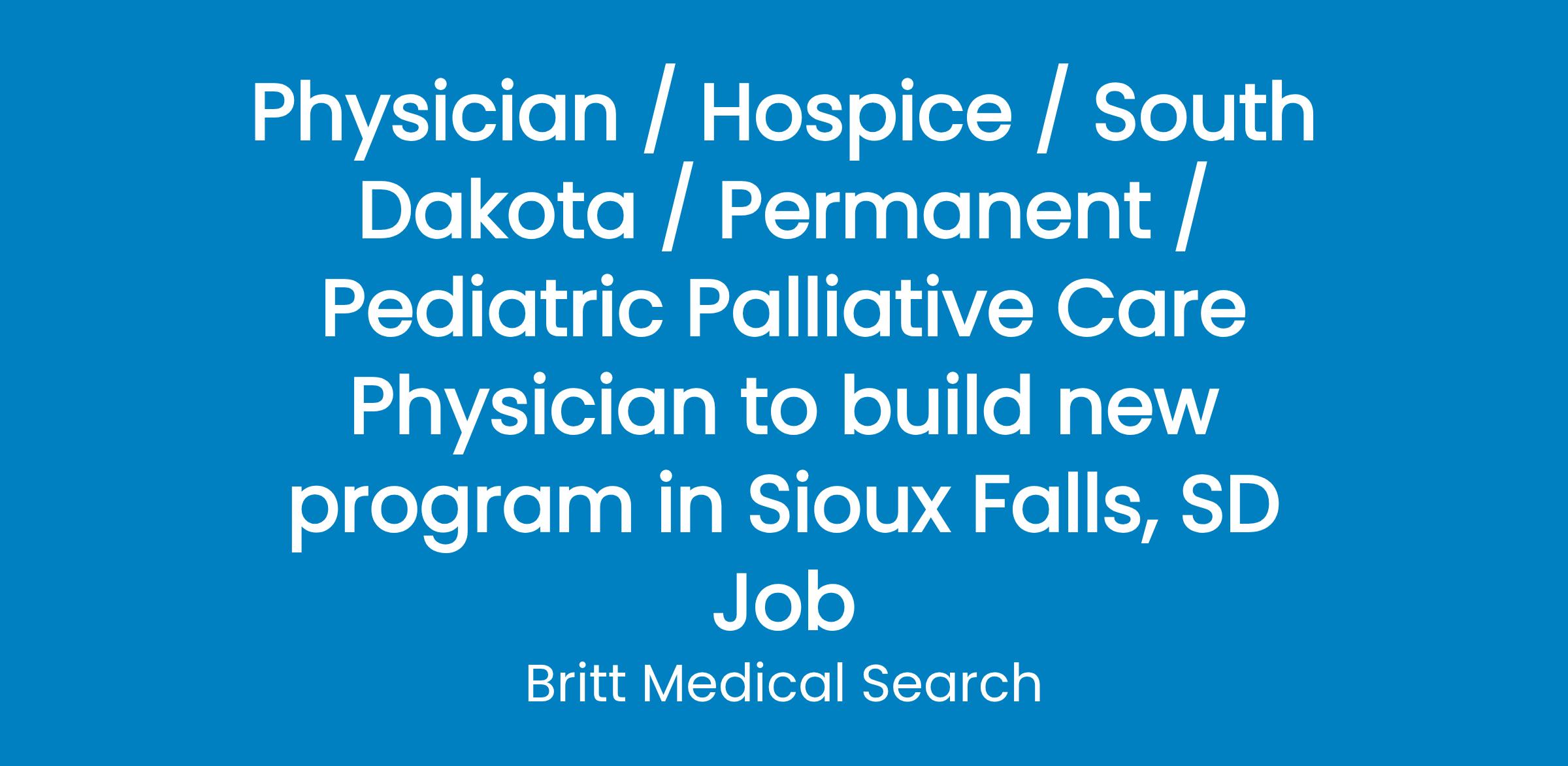 Medical Group is seeking a BE/BC Palliative Care Physician to join an established interdisciplinary team and develop a pediatric program in Sioux Falls, SD