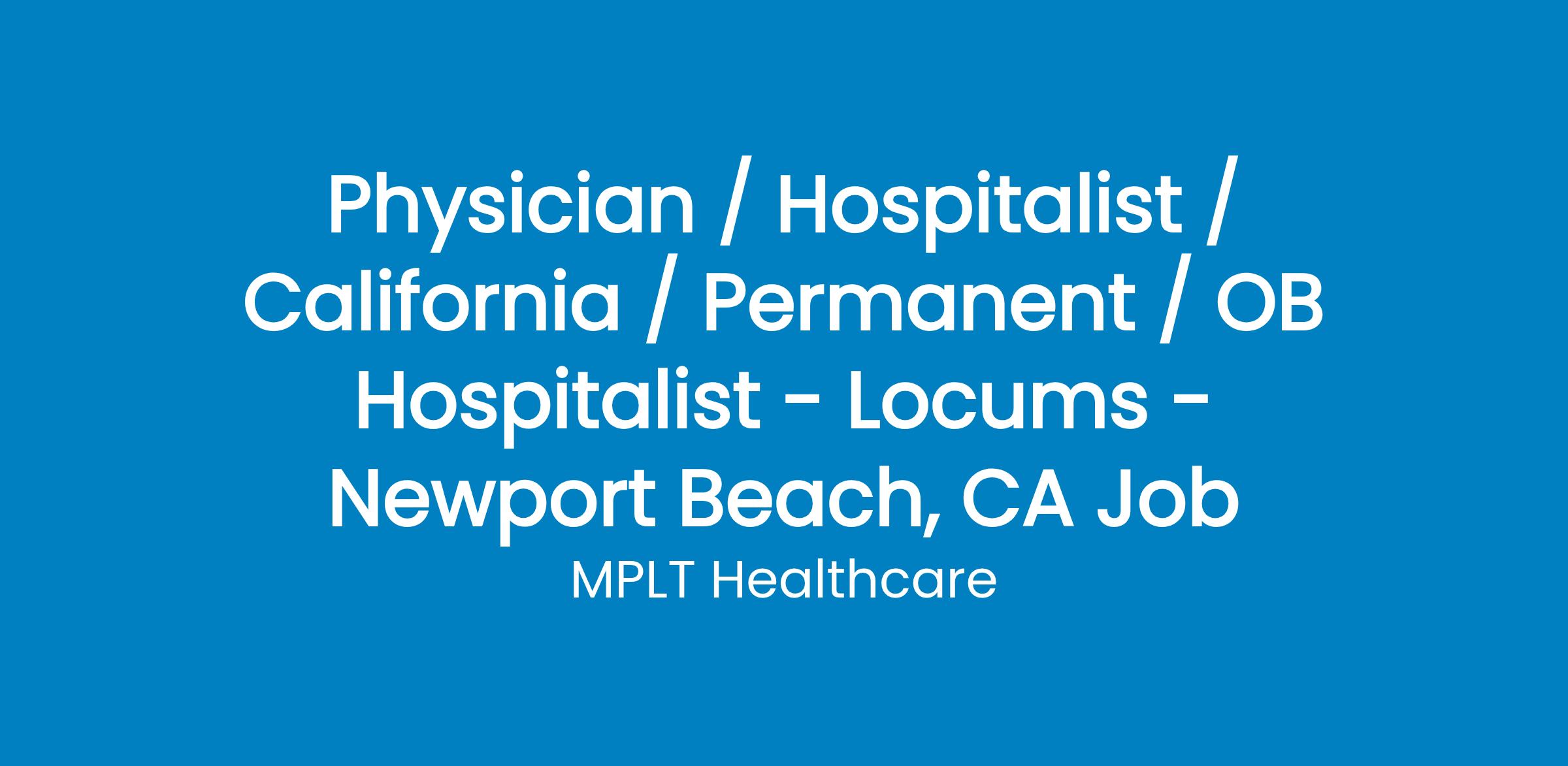 MPLT Healthcare is looking for physicians who Understand the Urgency, Never Give Up, and Have the Courage to Excel in the forever changing medical industry! We have numerous opportunities for an experienced OB Hospitalist with highly competitive pay rates in Newport Beach, CA.