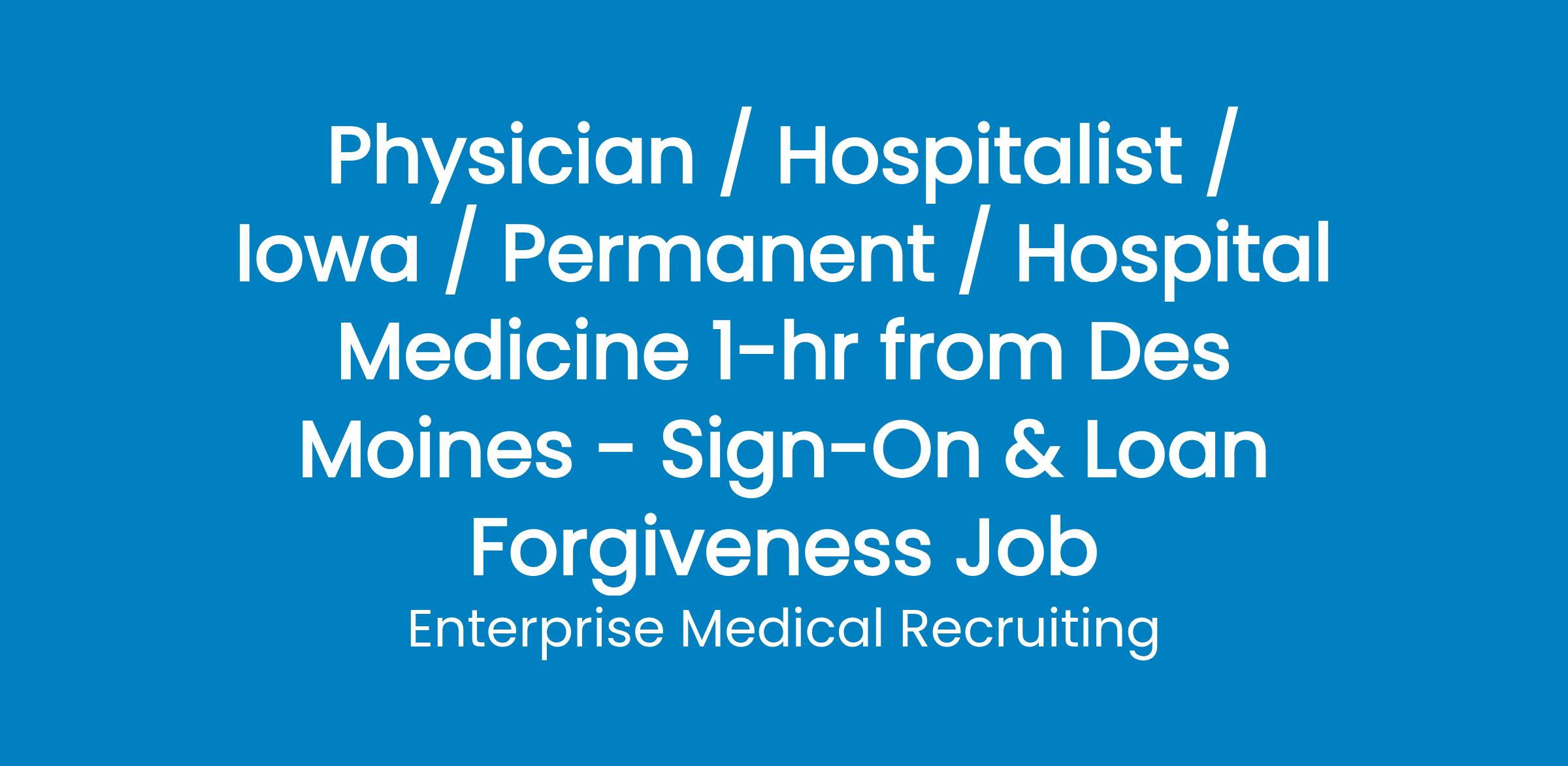 Enterprise Medical Recruiting is interviewing for a BC/BE Internal Medicine physician for a full-time permanent and employed Hospitalist position. Level 4 Trauma Center in Marion County, Iowa.