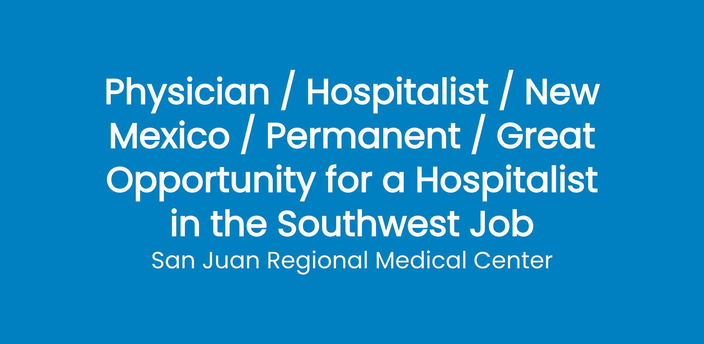 San Juan Regional Medical Center in Farmington, New Mexico is recruiting for a Hospitalist. This opportunity not only brings with it a great place to live, but offers a caring community and hospital environment with team dedicated to providing personalized, compassionate care. Procedures required$275,000-$295,000 base salary plus productivity and quality bonuses100% Hospitalist workWide variety of critical care Lucrative benefit package, including retirementSign on and relocationStudent loan repaymentQuality work/life balanceSan Juan Regional Medical Center is a non-profit and community governed facility. Farmington offers a temperate four-season climate near the Rocky Mountains with world-class snow skiing, fly fishing, golf, hiking and water sports. Easy access to world renowned Santa Fe Opera, cultural sites, National Parks and monuments. Farmingtons strong sense of community and vibrant Southwest culture make it a great place to pursue a work-life balance. Contact Terri Smith or (phone) (email) or