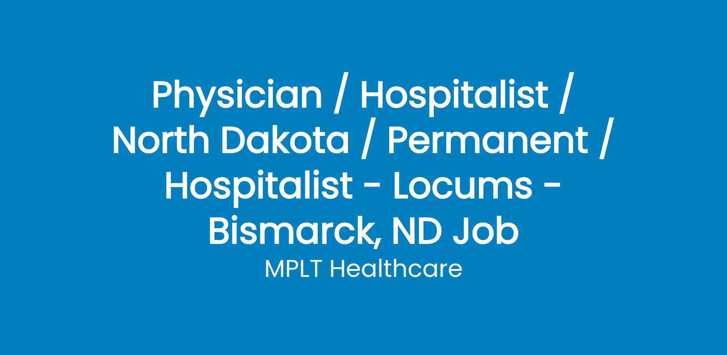 MPLT Healthcare is looking for physicians who Understand the Urgency, Never Give Up, and Have the Courage to Excel in the forever changing medical industry! We have numerous opportunities for an experienced Hospitalist with highly competitive pay rates in Bismarck, ND.