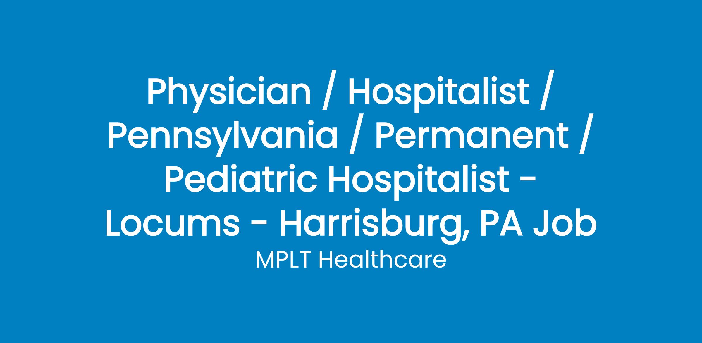 MPLT Healthcare is looking for physicians who Understand the Urgency, Never Give Up, and Have the Courage to Excel in the forever changing medical industry! We have numerous opportunities for an experienced Pediatric Hospitalist with highly competitive pay rates in Harrisburg, PA .